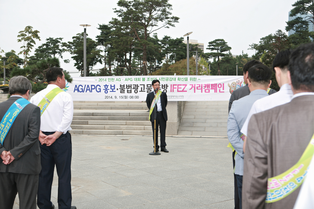 2014년 9월 15일 이종철 청장과 인천경제자유구역청 임직원들은 10월 인천아시안게임-인천장애인아시안게임을 맞이 거리캠페인과 청소를 실시하였다.