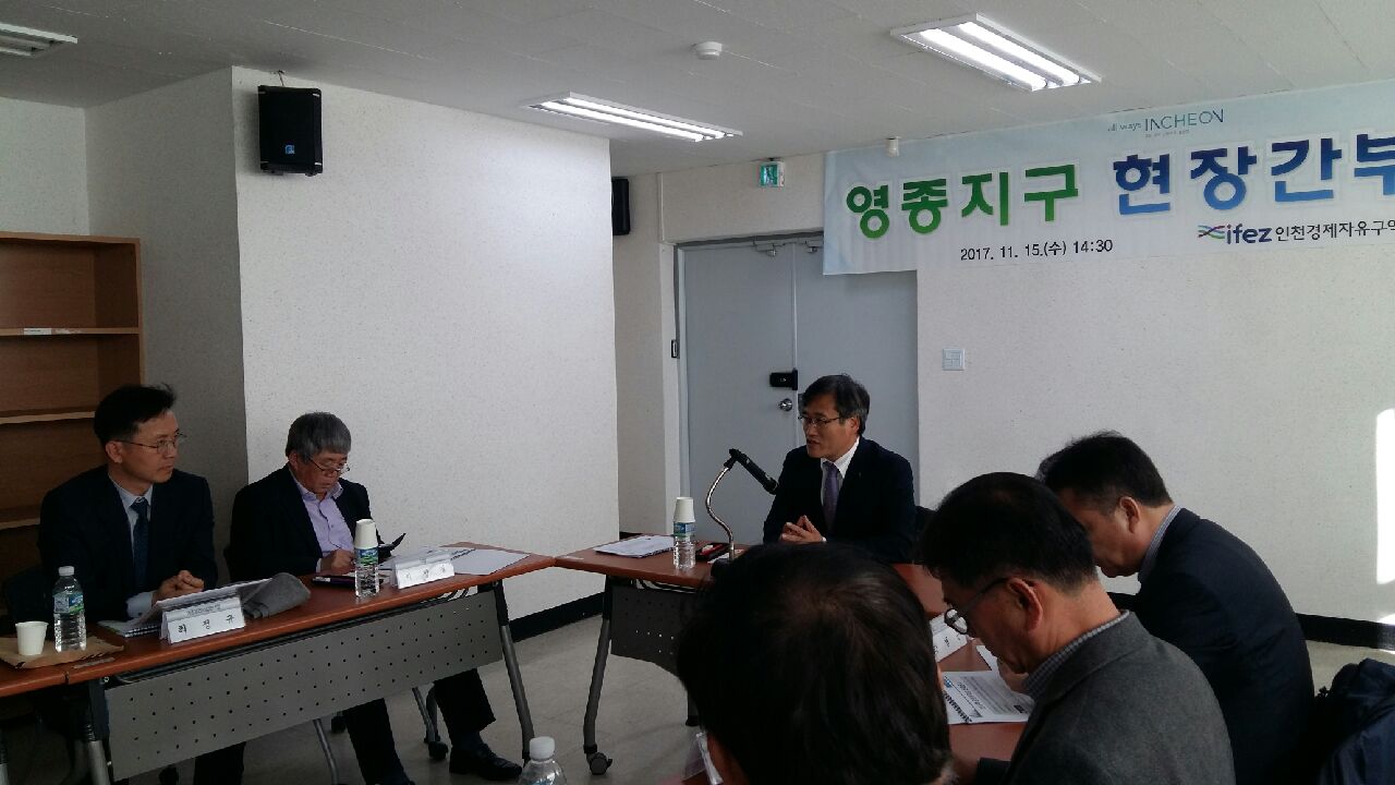 김진용 인천경제자유구역청장 15일 중구청 영종용유지원단 청사에서 경제청 과장 이상이 참석하는 영종지구 현장 간부회의를 개최하고 영종 주민들과의 대화시간도 가졌다.