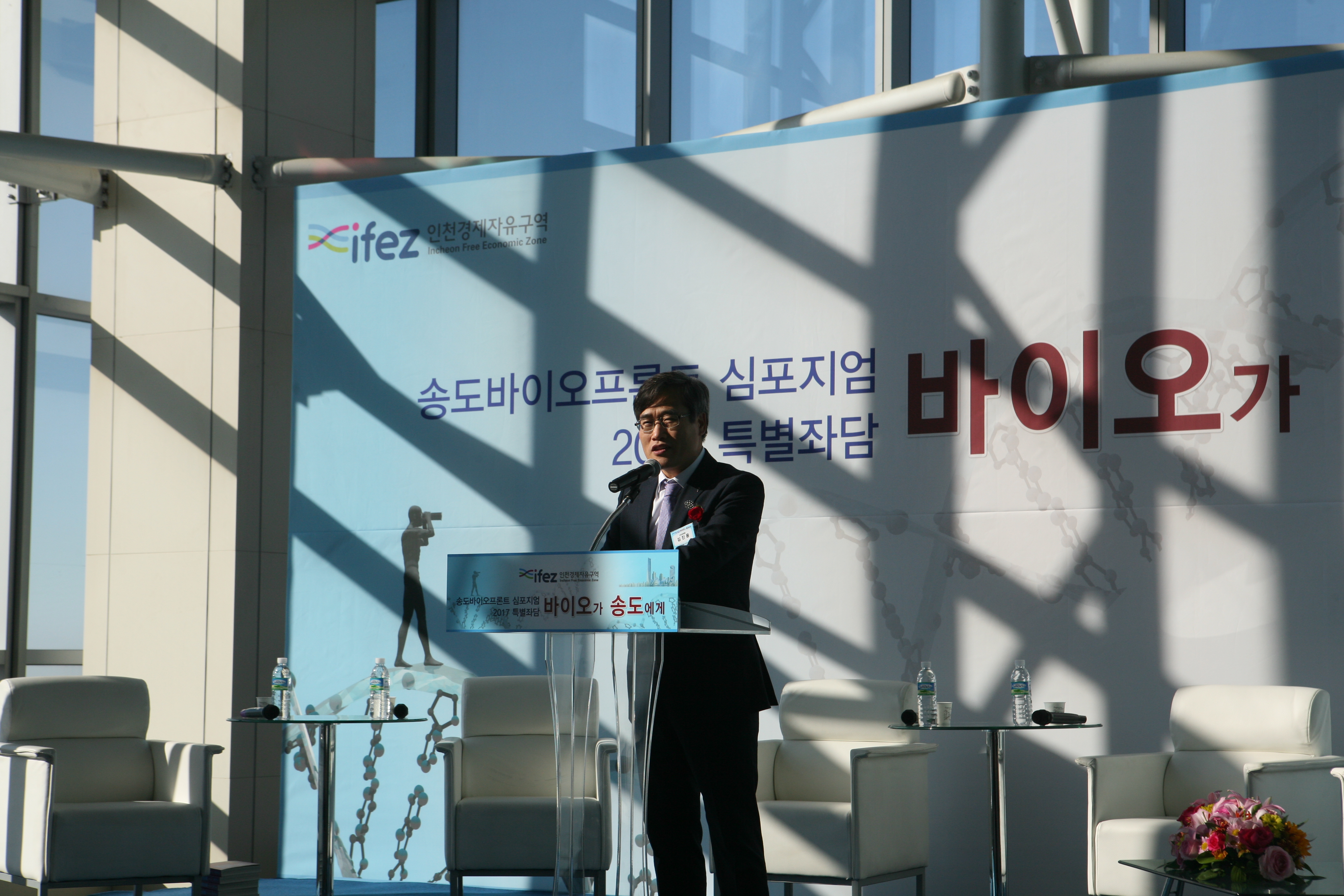 김진용 인천경제자유구역청장이 30일 '2017 송도 바이오프런트 심포지엄' 행사에 참석, 환영사를 하고 있다.