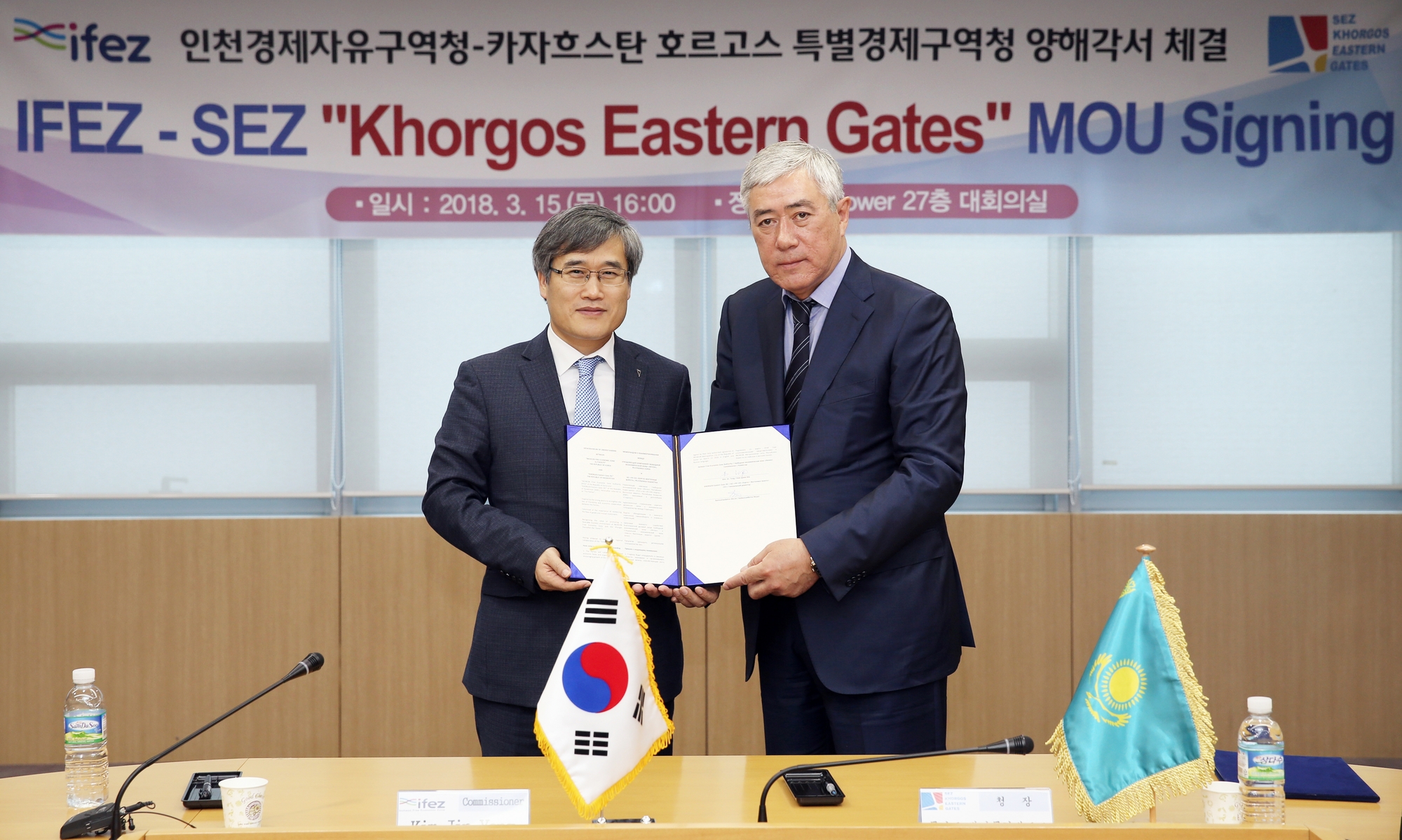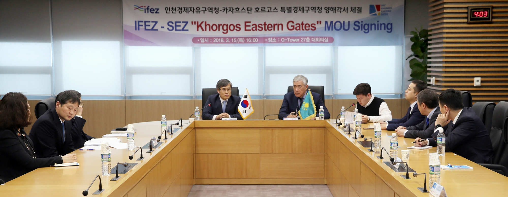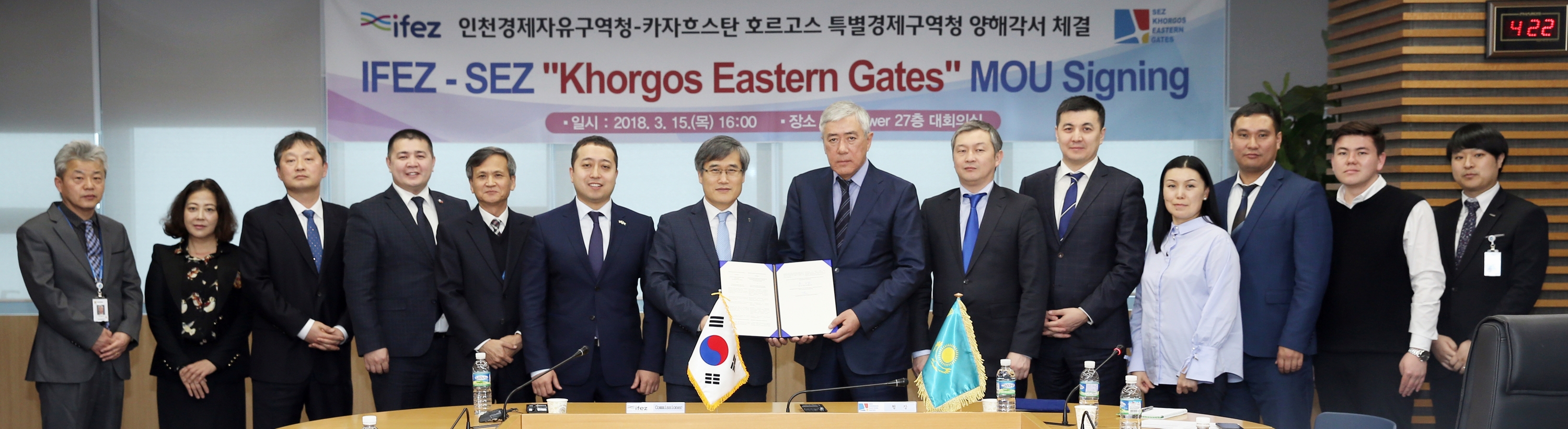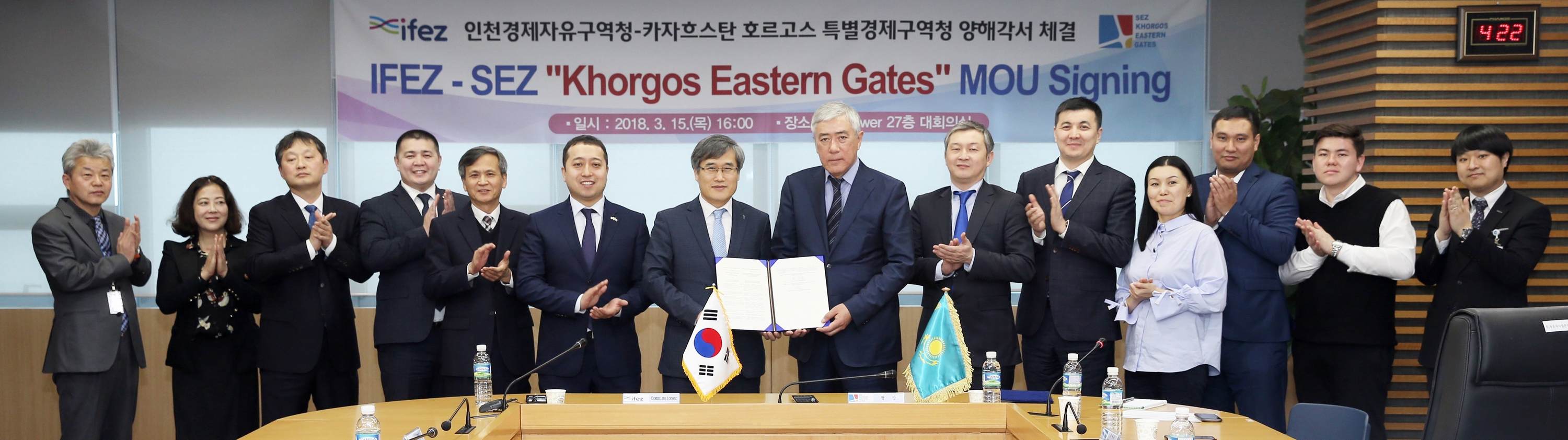 2018년 3월 15일(목요일), 김진용 청장은 카자흐스탄 호르고스 특별경제구역청과 상호협력에 관한 양해각서를 체결했다. 이번 양해각서는 이날 무라트 바이무한베토프(Murat Baimukhanbetov) 호르고스 특별경제구역청장의 IFEZ 방문과 관련해 벤치마킹 및 향후 상호 협력을 적극적으로 요청함에 따라 이뤄졌다.