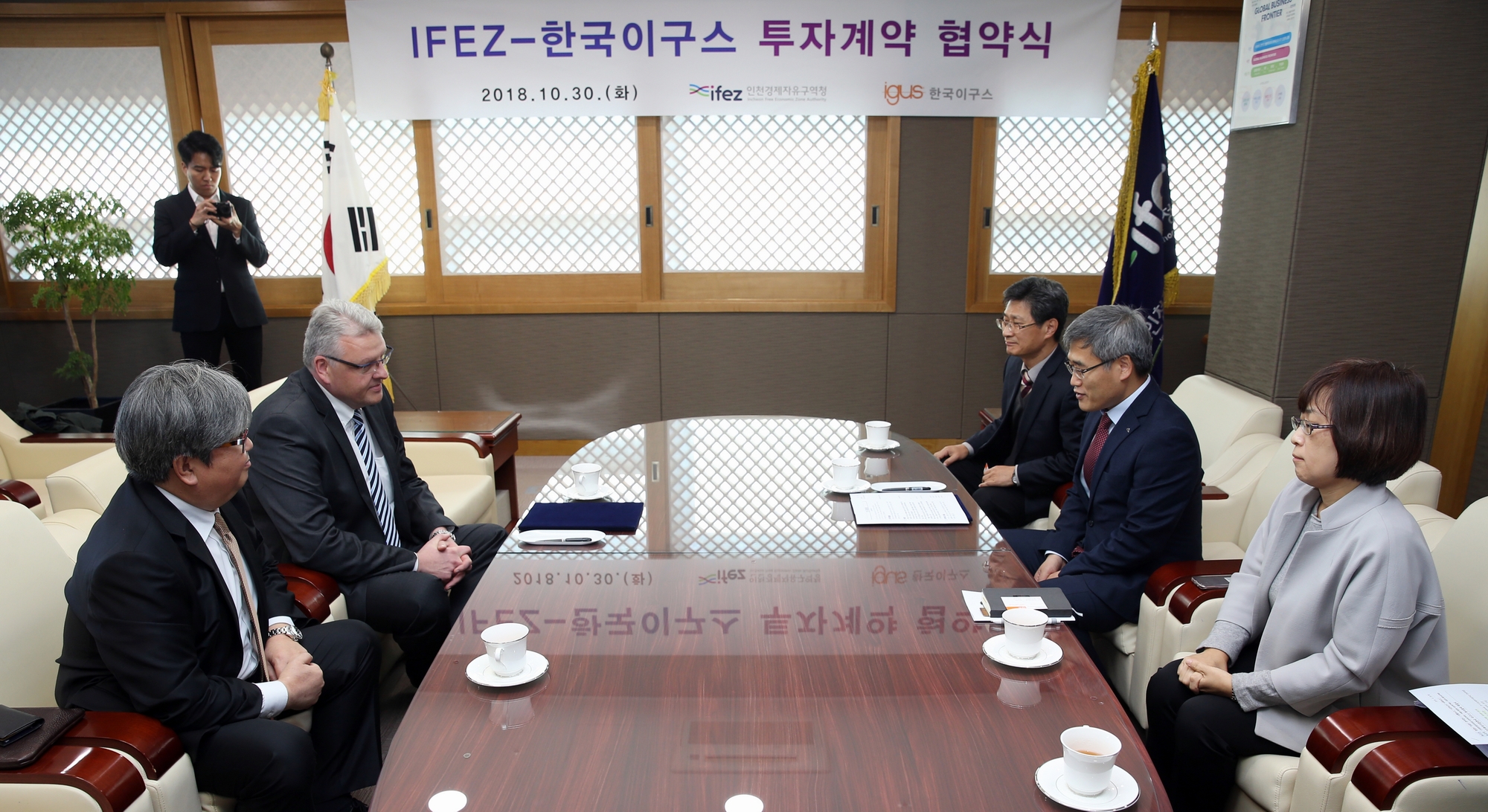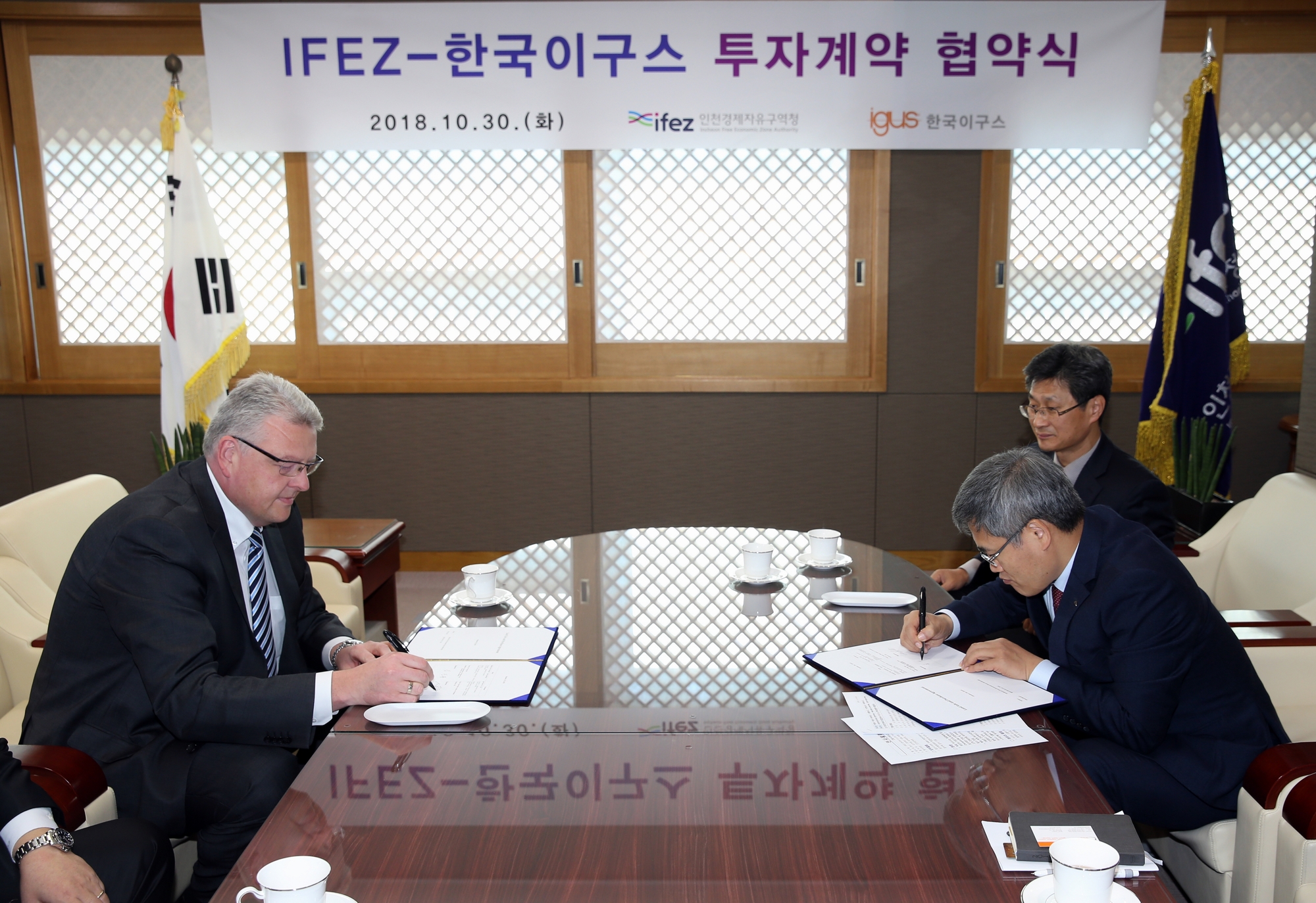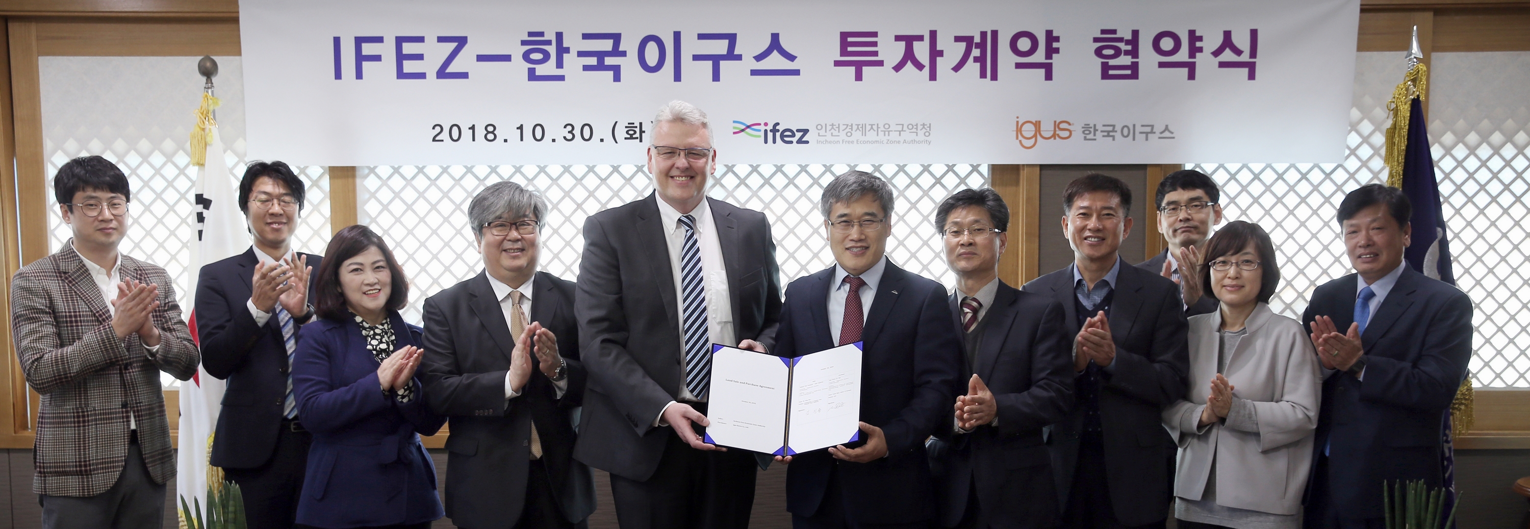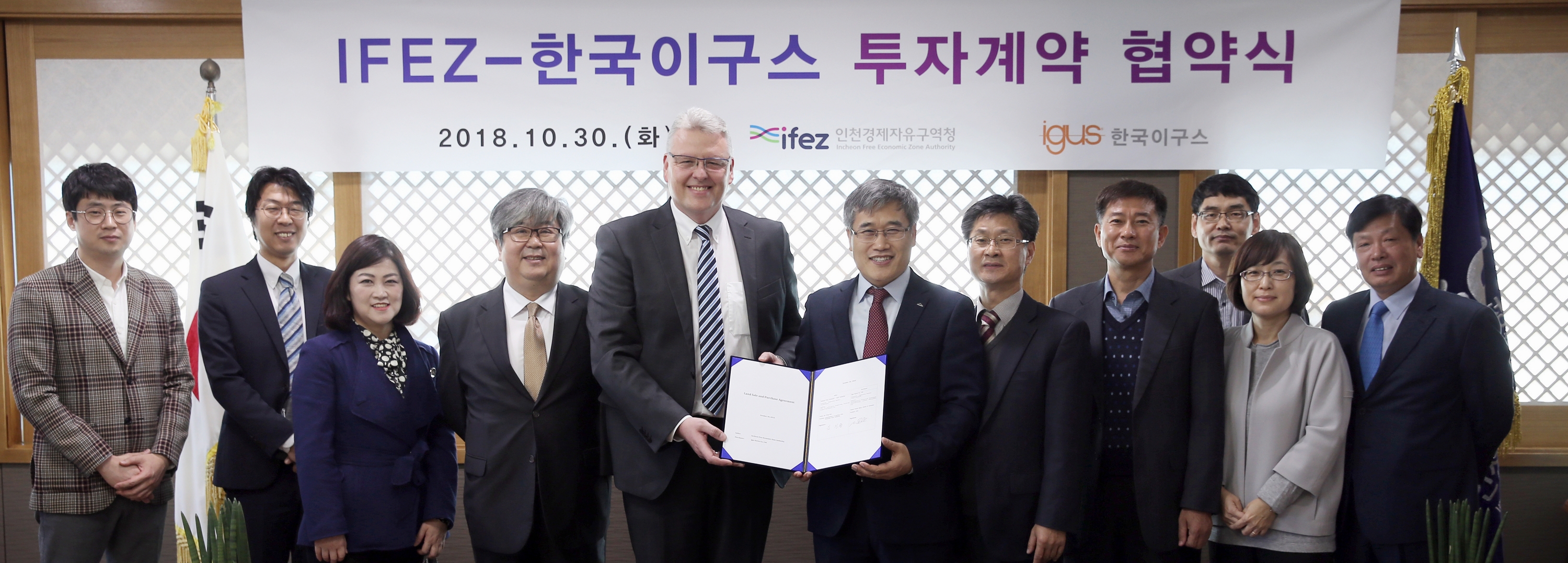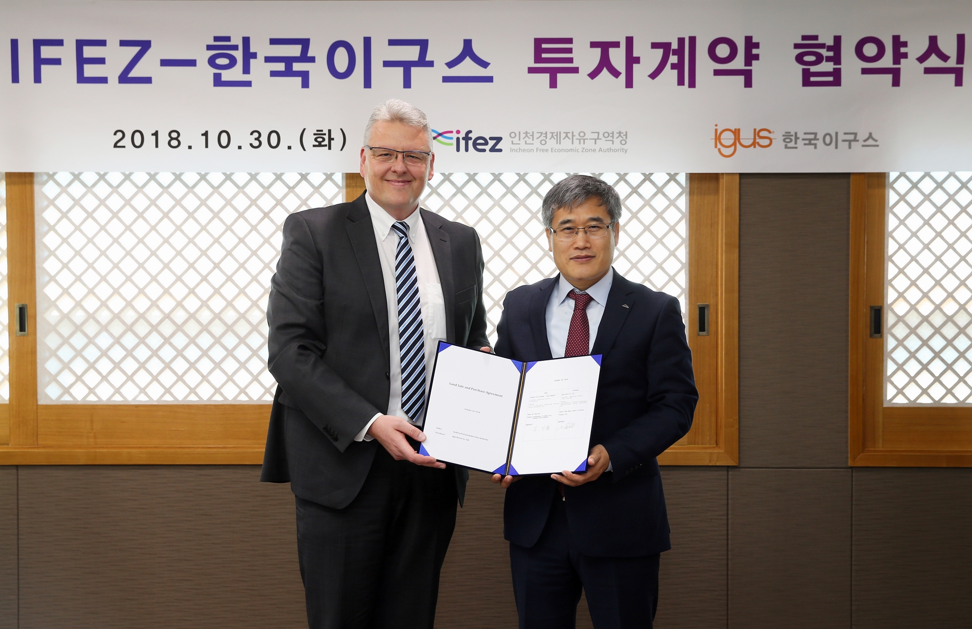 2018년 10월 30일(화요일) 김진용 청장은 이구스(igus) 첨단 부품생산 및 R&D 시설 건립을 위한 토지매매계약’을 체결했다. 이구는 4차 산업혁명의 핵심기술을 제품에 활용하는 스마트 팩토리(Smart Factory : 생산과정에 정보통신기술을 적용하는 지능형 생산공장)를 구현하는 독일 기업이다. 이번 체결을 통해 한국 이구스는 총 140억 원의 사업비를 들여 송도 첨단산업클러스터 내 Ic16부지(송도동 10-84,85) 9,498㎡에 3층 규모의 첨단 부품생산 및 R&D 시설을 2018년 11월에 착공해서 2019년 말까지 건립할 계획이다.