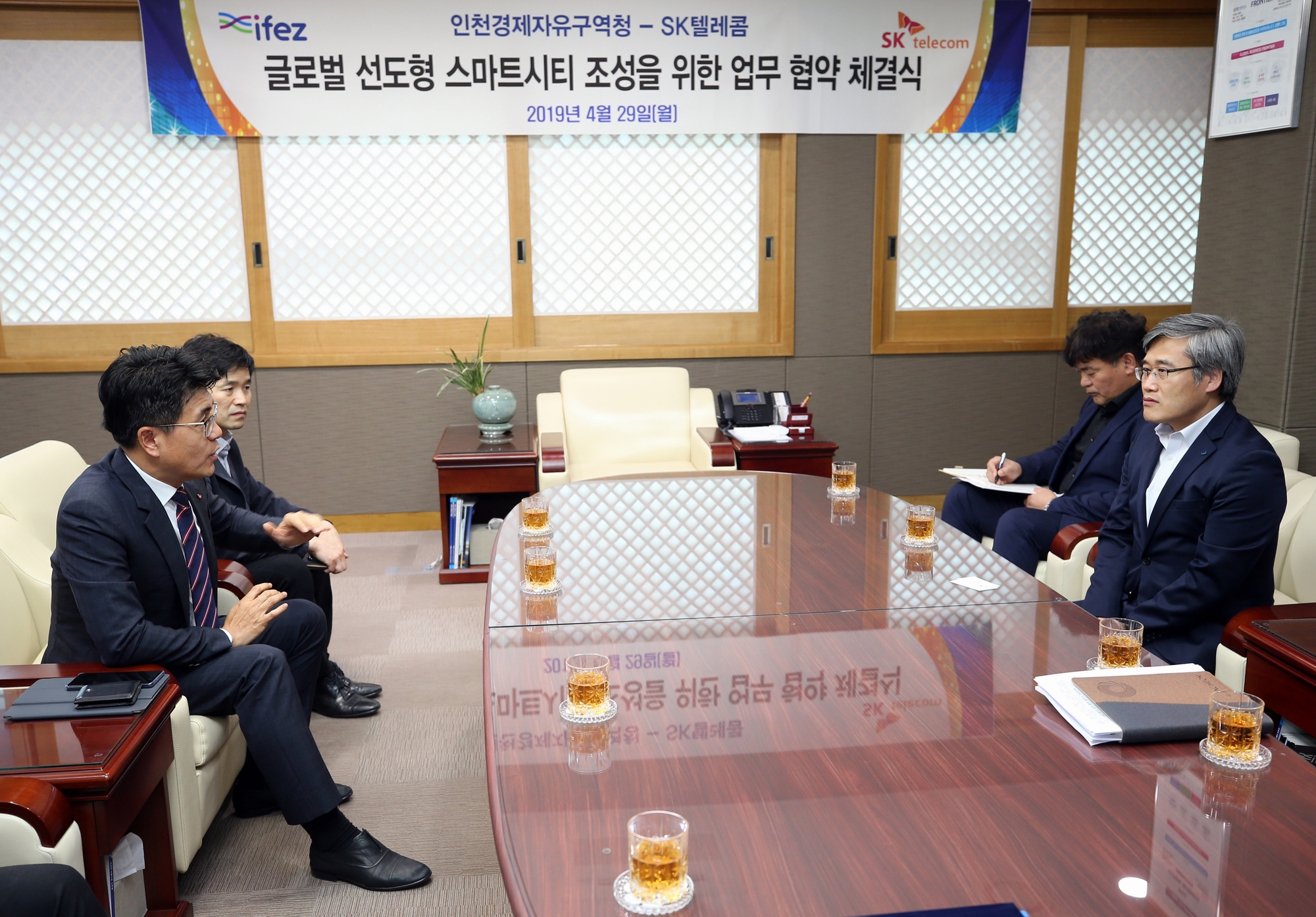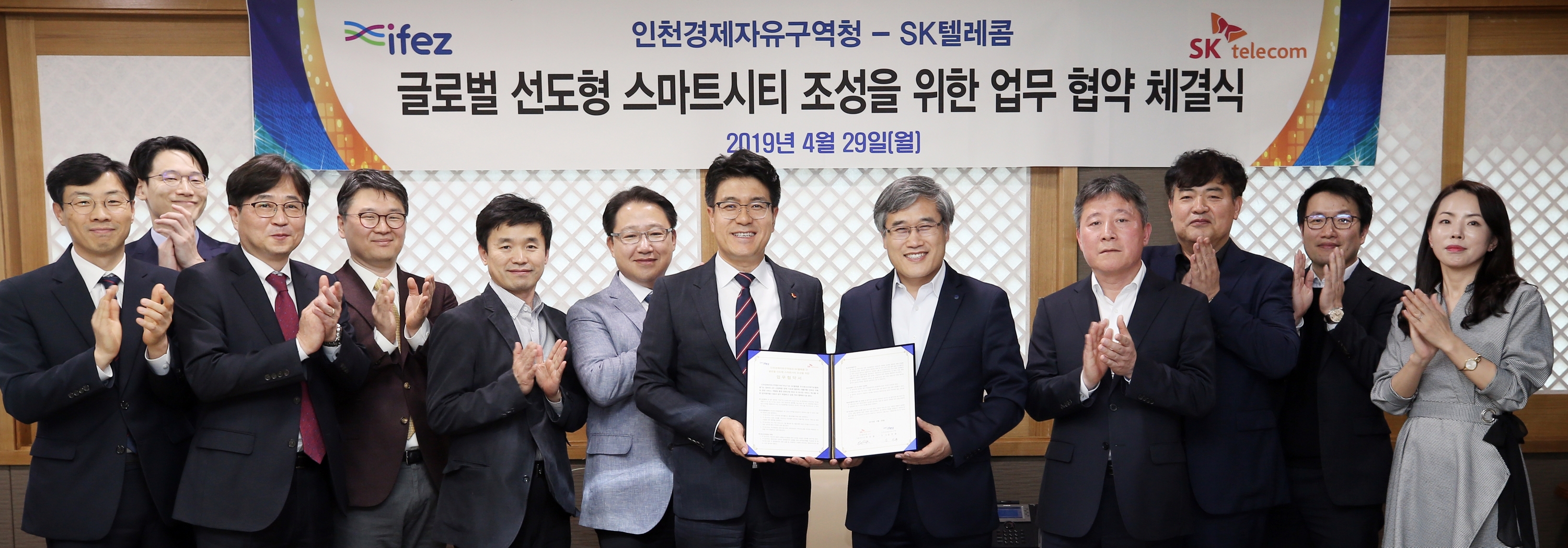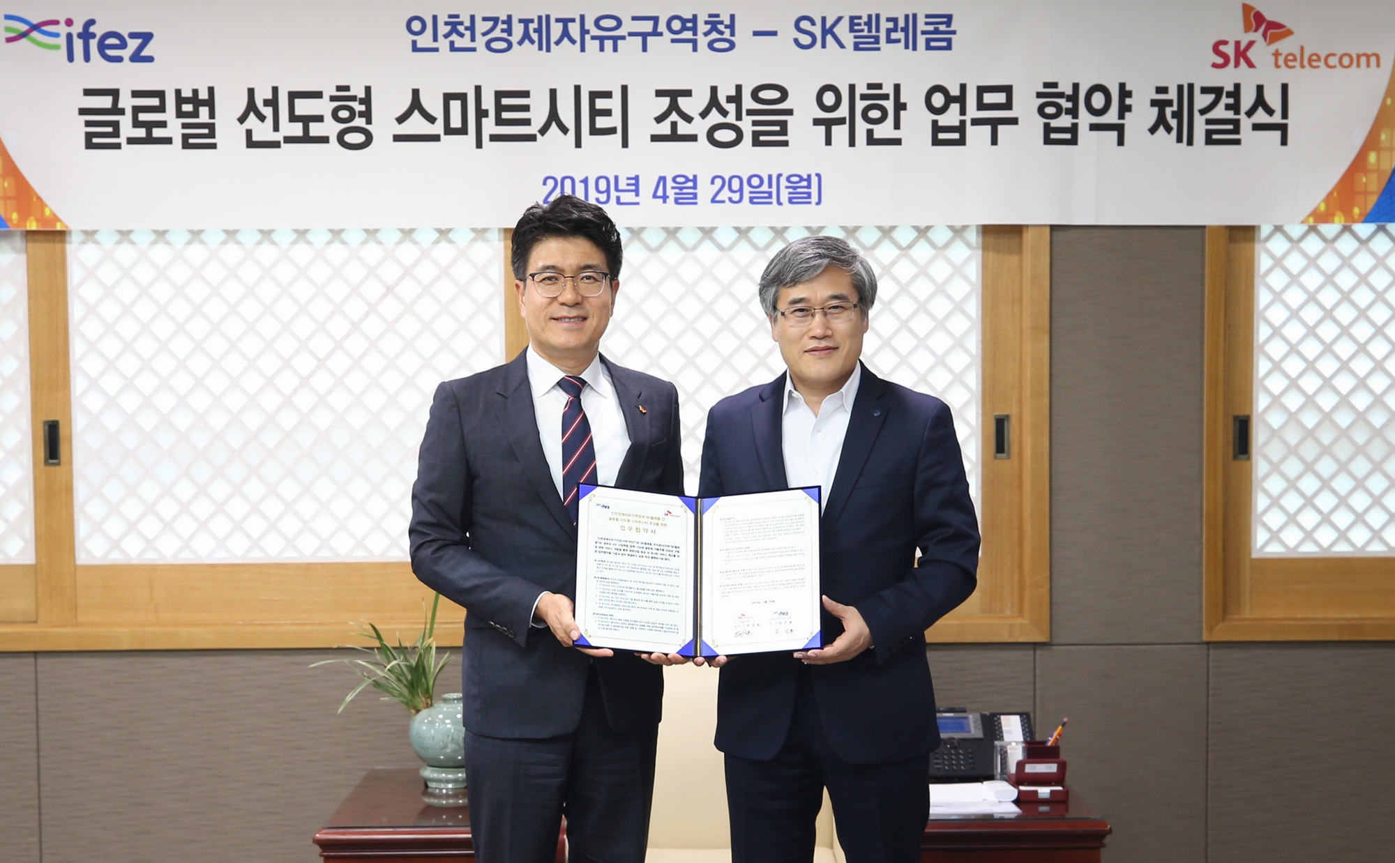 2019년 4월 29일(월요일) 김진용 청장은 SK텔레콤과 상호 협력 협약을 체결하였다. 이번 협약 체결로 인천경제자유구역(IFEZ) 스타트업 벤처폴리스 활성화, 민·관 협력 방식의 자율주행 인프라 구축 및 관련 사업 추진, 5G 기반 서비스와 기술 활성화 사업을 진행하게 된다. 스타트업 벤처폴리스 사업은 인천광역시의 강점인 스마트시티 인프라 및 데이터를 개방, 공유하고, 이를 기반으로 ‘스타트업&벤처’의 자본적, 정책적, 기술적 육성 프로그램을 마련하기 위해 추진되는 사업이다. 현재 연세대학교, 인천대학교, 인하대학교를 비롯한 인천 내 대학들과 인천테크노파크, 인천창조경제혁신센터, KAIA(한국교통과학기술진흥원) 등 정부기관 및 민간 엑셀러레이터(Accelerator:창업 기획자) 등이 참여하고 있다. 인천경제자유구역청과 SK텔레콤이 민·관 협력을 통해 추진할 글로벌 선도형 스마트 시티 자율 주행 인프라 구축 사업은 초정밀전자지도(HD맵), 5G, 데이터허브 등을 IFEZ 내에 우선 시범 적용하는 것으로, HD맵은 자율주행차량이 안전하게 운행할 수 있도록 센티미터(cm) 수준으로 정밀하게 공간 정보를 제공하는 자율주행차량 전용 지도를 말한다. 송도국제도시·청라국제도시·영종국제도시의 유동인구 데이터를 체계적으로 관리하고 분석할 수 있는 데이터 허브도 구축한다.
