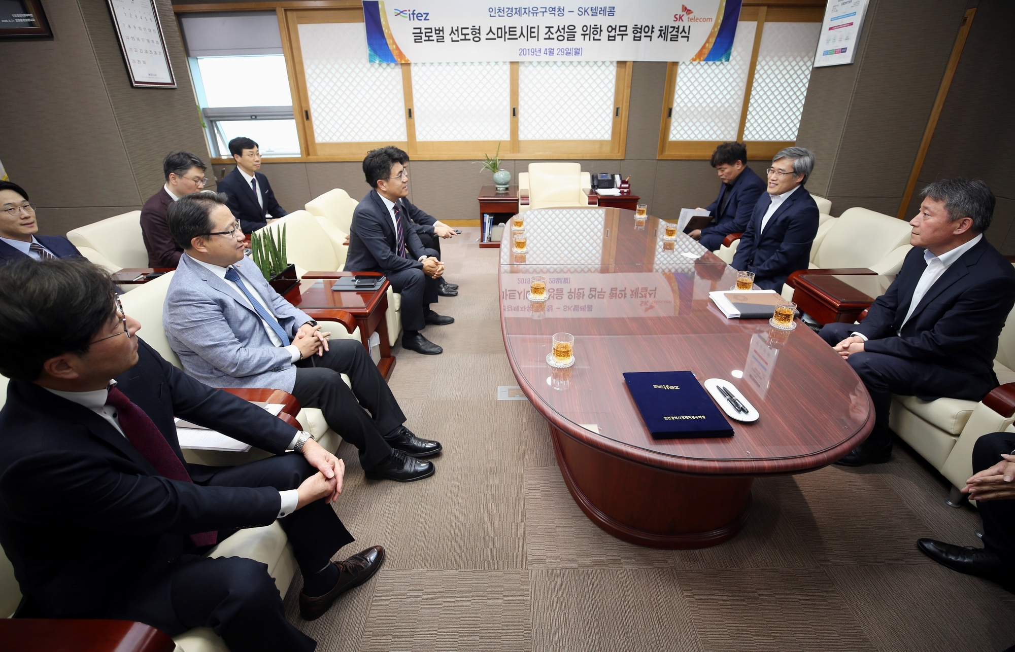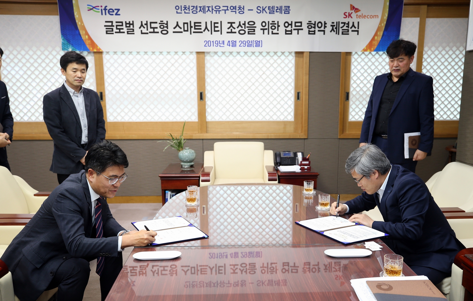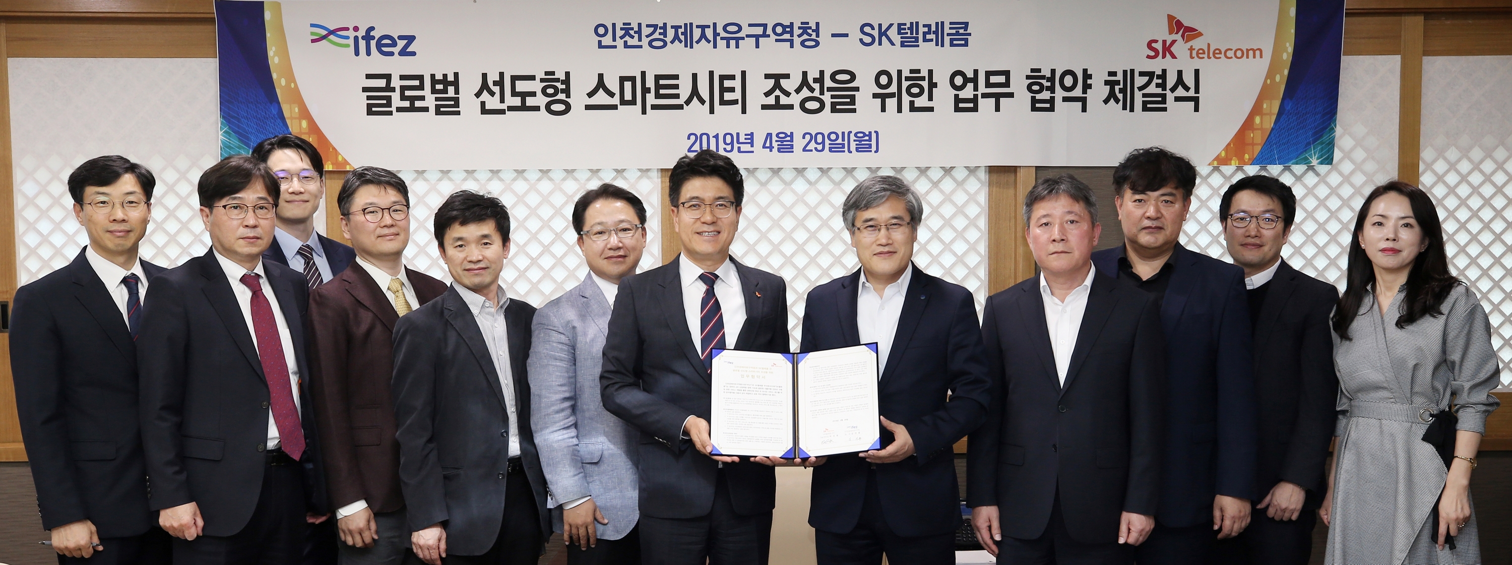 2019년 4월 29일(월요일) 김진용 청장은 SK텔레콤과 상호 협력 협약을 체결하였다. 이번 협약 체결로 인천경제자유구역(IFEZ) 스타트업 벤처폴리스 활성화, 민·관 협력 방식의 자율주행 인프라 구축 및 관련 사업 추진, 5G 기반 서비스와 기술 활성화 사업을 진행하게 된다. 스타트업 벤처폴리스 사업은 인천광역시의 강점인 스마트시티 인프라 및 데이터를 개방, 공유하고, 이를 기반으로 ‘스타트업&벤처’의 자본적, 정책적, 기술적 육성 프로그램을 마련하기 위해 추진되는 사업이다. 현재 연세대학교, 인천대학교, 인하대학교를 비롯한 인천 내 대학들과 인천테크노파크, 인천창조경제혁신센터, KAIA(한국교통과학기술진흥원) 등 정부기관 및 민간 엑셀러레이터(Accelerator:창업 기획자) 등이 참여하고 있다. 인천경제자유구역청과 SK텔레콤이 민·관 협력을 통해 추진할 글로벌 선도형 스마트 시티 자율 주행 인프라 구축 사업은 초정밀전자지도(HD맵), 5G, 데이터허브 등을 IFEZ 내에 우선 시범 적용하는 것으로, HD맵은 자율주행차량이 안전하게 운행할 수 있도록 센티미터(cm) 수준으로 정밀하게 공간 정보를 제공하는 자율주행차량 전용 지도를 말한다. 송도국제도시·청라국제도시·영종국제도시의 유동인구 데이터를 체계적으로 관리하고 분석할 수 있는 데이터 허브도 구축한다.
