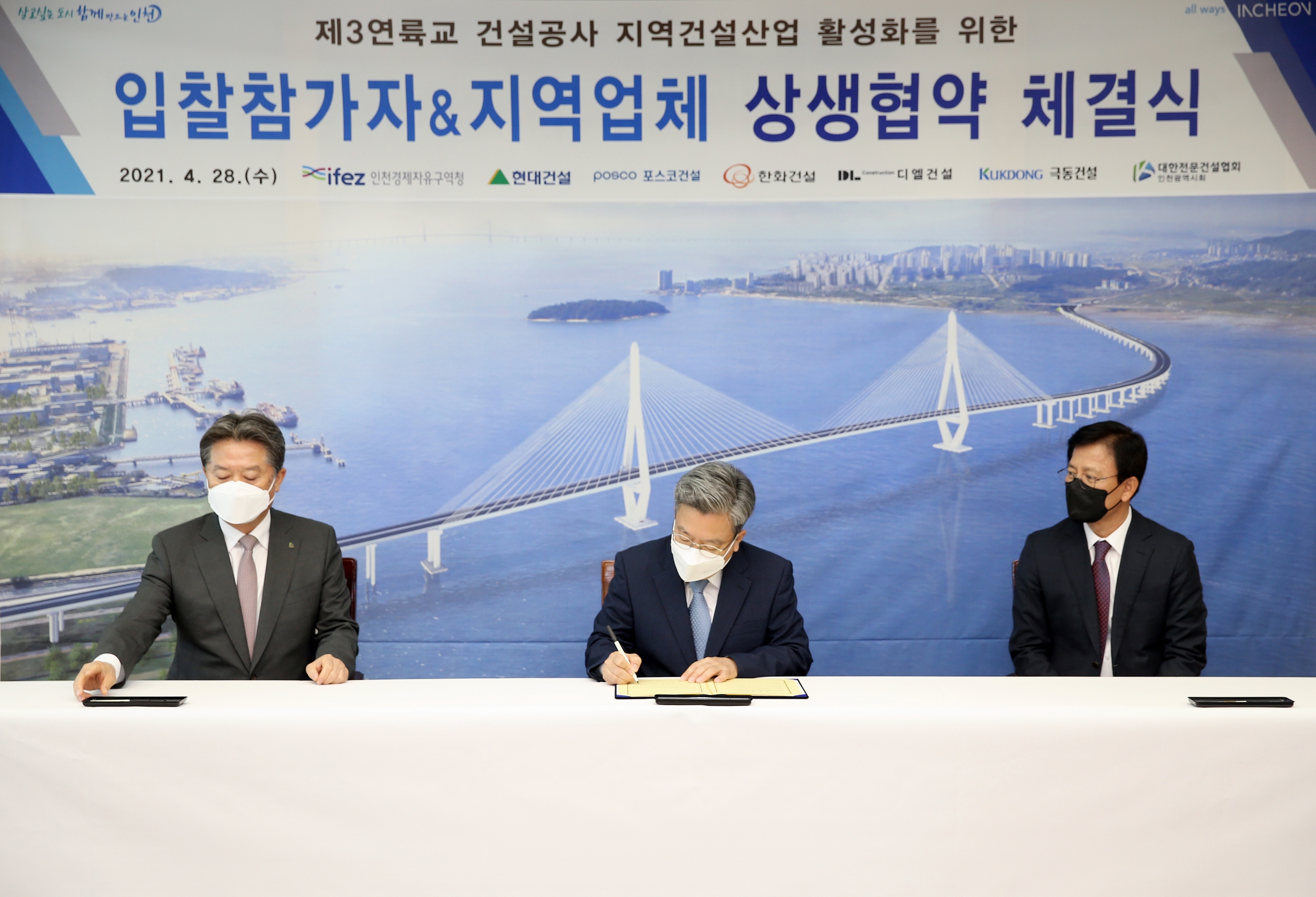 2021년 4월 28일(수요일) 이원재 청장은 송도국제도시 G타워와 청라국제도시 제3연륙교 건설 현장 등에서 지역 건설산업 활성화를 위한 상생협약서 체결과 ‘입찰 참가자와 지역업체 만남의 장’ 행사를 잇달아 개최했다. 입찰 단계부터 입찰참가자인 대형건설사가 실적이 다소 부족하더라도 신기술·특허공법 등 기술력이 우수한 지역업체는 기술제안 설계에 반영하고 또 시공성이 우수한 전문건설업체들을 협력업체로 등록시켜 향후 입찰기회를 제공, 참여를 확대함으로써 제3연륙교 건설과 관련해 지역업체 하도급률 향상의 실효성을 높일 수 있을 것으로 기대하고 있다. 오는 2025년 준공 예정인 제3연륙교는 길이 4.67㎞, 폭 29m의 왕복 6차로와 보도 및 자전거도로로 건설된다. 2025년 완공 및 개통이라는 시민들과의 약속을 지키기 위해 토목공사에서는 지방자치단체 최초로 실시설계 기술제안 입찰방식이 적용돼 추진 중에 있다.