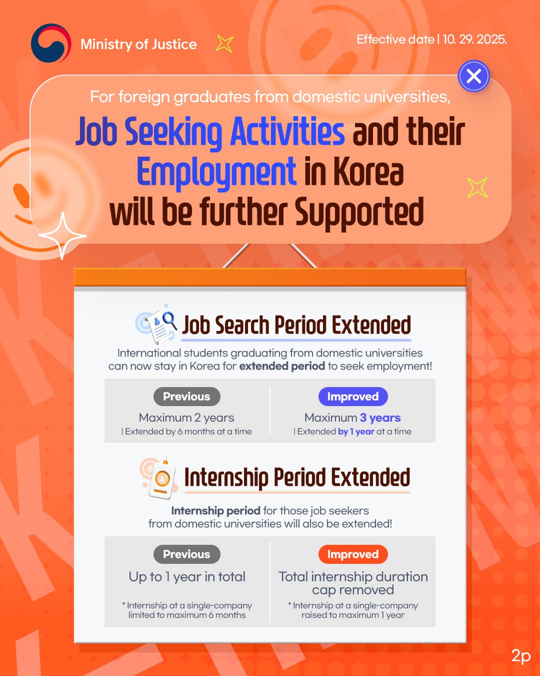For international graduates holding a Job Seeker (D-10) visa, the duration of stay and the scope of job-seeking activities have been extended,