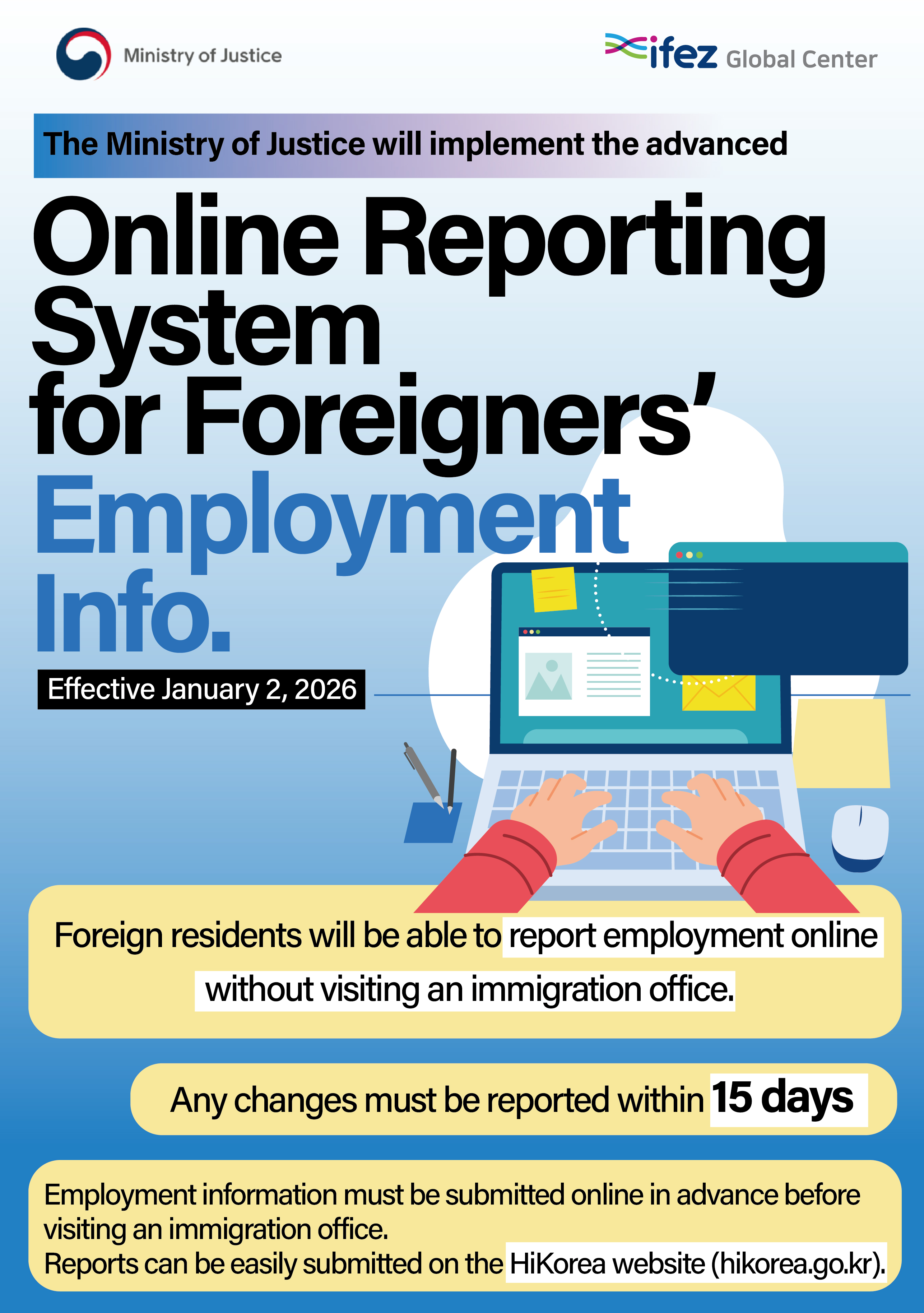 The Ministry of Justice will implement the advanced Online Reporting System for Foreigners’ Employment Information effective January 2, 2026 (Fri.).