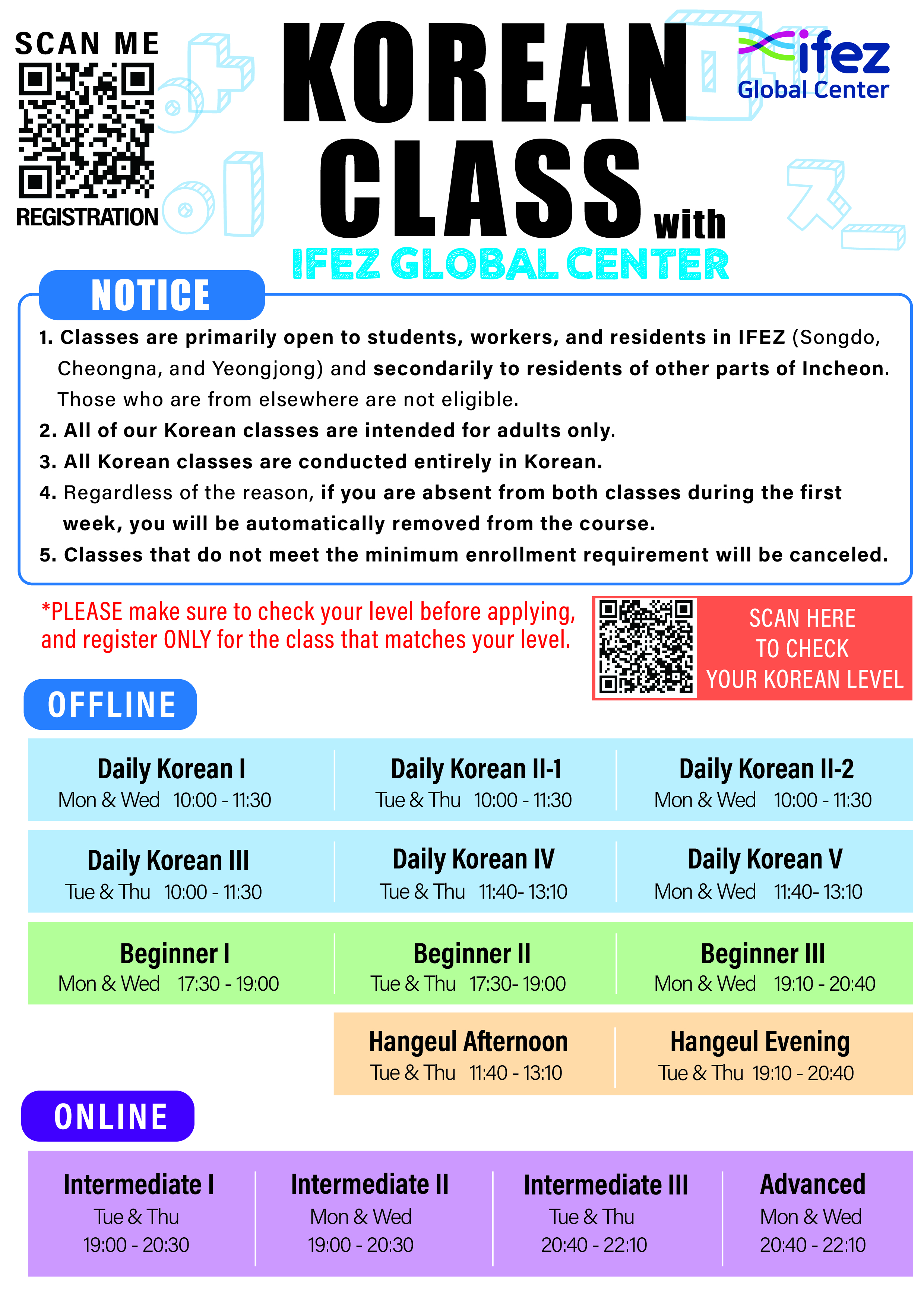 Please note that this is for the regular Korean language course, not the Hangeul (Korean alphabet) class.