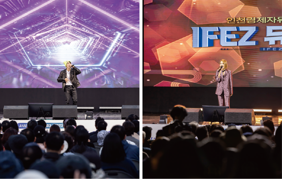 인천 시민의 날과 같은 날에 열린 이번 IFEZ 20주년 기념행사는 시민들과 함께 호흡하기 위한 하나의 축제로 기획됐다. 오후 6시에 시작되는 기념식 이전부터 행사장소였던 송도 센트럴파크에 축제의 기운이 감돌았다. 잔디광장에서는 세계문화를 체험할 수 있는 부대행사 ‘글로벌 빌리지’가 오후 1시부터 운영됐으며, 기념식 30분 전부터는 식전행사가 열렸다. 가장 먼저 붓글씨 퍼포먼스가 진행됐다. 서예가 박영동 씨는 큰 붓으로 종이에 ‘미래가 찾아오는 눈부신 도시 IFEZ’를 한 글자씩 써 내려갔다. 다음으로는 로얄어린이합창단과 인천 출신 가수 로이스의 공연이 이어졌다.