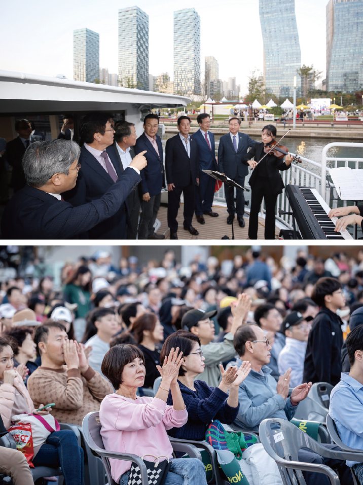 1 이번 행사에 참석한 내빈이 전기선박 센트럴커낼호를 타고 행사장으로 이동하고 있다.