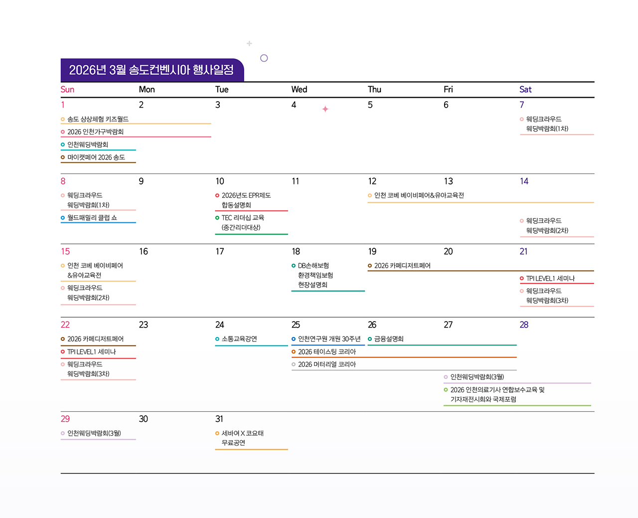 MICE 산업에 있어 가장 중요한 인프라 중 하나는 전시컨벤션센터이다. 국제 회의부터, 인센티브 관광, 각종 전시박람회 등 복합적인 산업을 아우르는 송도의 랜드마크, 송도컨벤시아. 최대 450부스까지 수용 가능한 전시장은 물론 국제 회의장, 행사장이 마련되어 다양한 국내외 컨벤션 행사들을 성공적으로 유치하며 MICE 산업의 떠오르는 도시로 성장하고 있다. MICE 산업의 떠오르는 메카, 송도컨벤시아의 이달의 이슈부터 행사일정까지 한 눈에 담았다.
