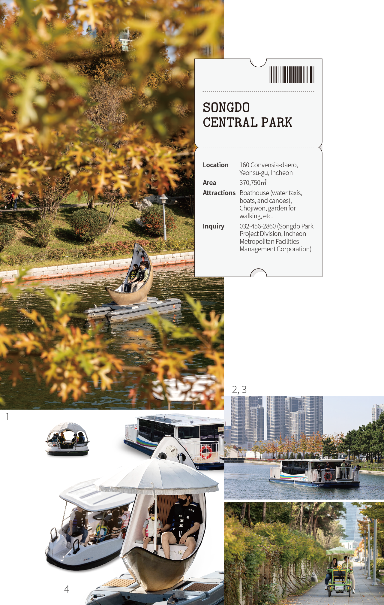 You can also take a water taxi from the West Boat House, opposite the west entrance. It travels along the freshwater canal that crosses Songdo Central Park to UN Square before returning to the dock. This 20-minute route offers a unique view of Central Park. Meanwhile, eco-friendly electric boats, introduced in mid-October, are making trips to the park quieter and more efficient.