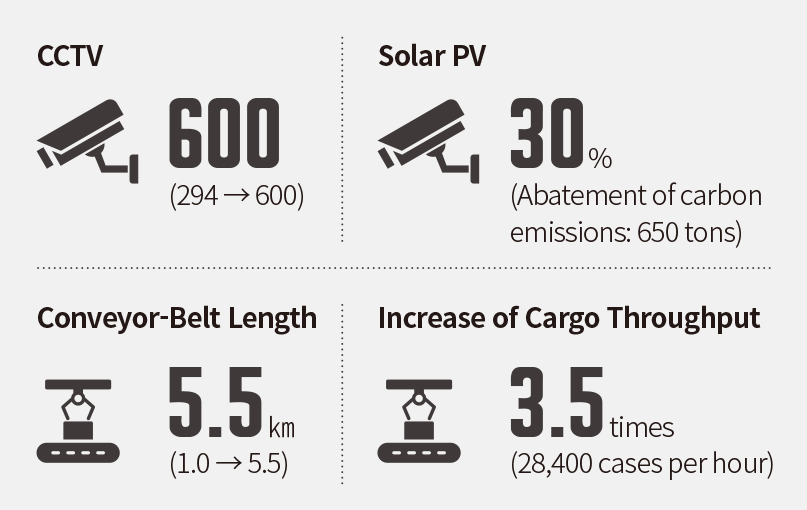 DHL Incheon Gateway, the largest cargo terminal in the Asia-Pacific region, boasts cutting-edge technology. DHL Korea further enhanced its logistics-process capabilities by increasing the number of automatic X-ray systems (from nine to 19) for inspecting cargo and by extending the conveyor-belt length from 1 to 5.5 km. As a result, the amount of load handled per hour increased from 8,100 to 28,400, while the delivery time for imported goods was shortened by more than 30 minutes. This gateway is also equipped with eco-friendly infrastructure facilities. As a first among Incheon International Airport’s cargo terminals, the gateway introduced a 1MW solar power generation facility for the entire upper area of the building (5,700 ㎡). This facility covers approximately 30% of the power consumption, thereby reducing annual carbon emissions by about 650 tons.