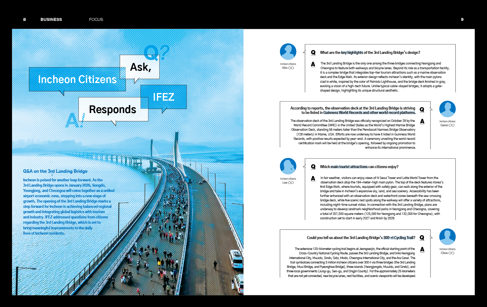 For a long time, the sea surrounding Incheon functioned as a boundary between islands and the mainland. However, very soon, a new bridge will rise over these waters, redefining how daily life in the city is connected. This is the 3rd Landing Bridge, which links Jungsan-dong in Jung-gu with Cheongna-dong in Seo-gu. With a total length of 4.68 kilometers, a width of 30 meters, and six lanes for two-way traffic, the bridge is scheduled to open on January 5, 2026, and will be the only one among the three bridges serving Yeongjong International City to feature both pedestrian walkways and bicycle lanes. With its opening, the 3rd Landing Bridge is expected to emerge as a tourist landmark attracting global attention that goes beyond its role as a mere transportation facility. The highlight of the bridge is its marine observation deck, soaring to a height of 184.2 meters. It sets a new global record for marine bridge observatories, standing 56 meters taller than the Penobscot Narrows Bridge Observatory (128 meters) in the U.S. state of Maine. Having earned certification from the World Record Committee (WRC) in the United States for the World’s Highest Marine Bridge Observation Deck, the Incheon Free Economic Zone Authority (IFEZ) is preparing for its listing in Guinness World Records (GWR) to coincide with the bridge’s opening. Now, the bridge stands ready to emerge as a new landmark for Incheon. The observation deck offers a breathtaking panorama, where the skylines of Cheongna and Yeongjong International City merge with the West Sea. In fair weather, visitors can see even N Seoul Tower and Lotte World Tower at a glance. Another highlight is the “Edge Walk,” which will come into operation following the bridge’s opening. Wearing safety equipment, visitors can walk along the exterior of the observation deck at a height of 180 meters and take in the sweeping cityscape of Incheon stretching out beneath their feet. Such a thrilling adventure, rarely found anywhere else in the world, is set to unfold at the 3rd Landing Bridge.