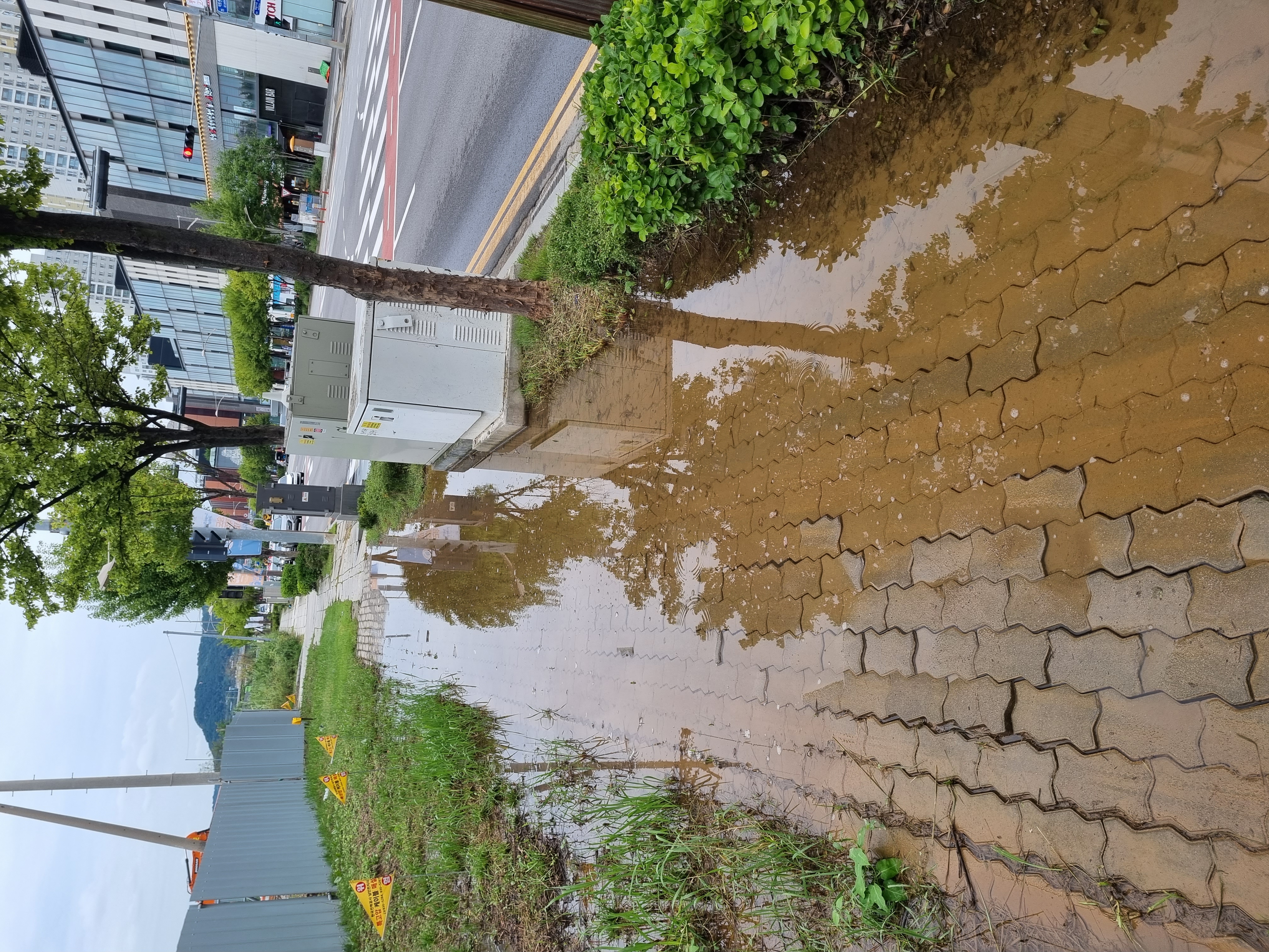 도보로 통행이 힘듭니다. 흘러나온 물로 차량 통행시 물이 튀기도 합니다.