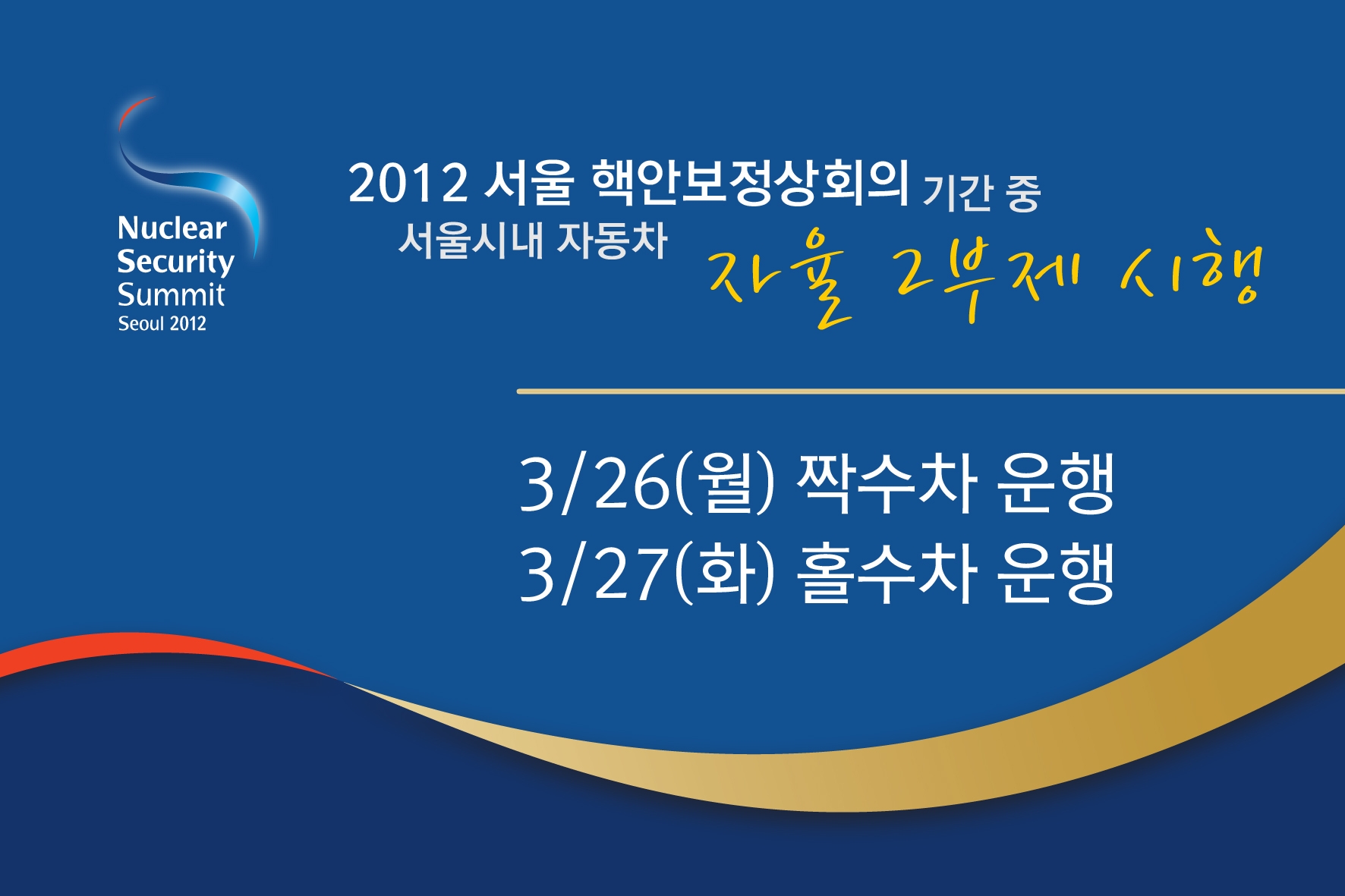 ◈ 2012 서울 핵안보정상회의 기간 중 서울시내 자동차 자율 2부제 시행 - 3.26(월) 짝수차 운행 - 3.27(화) 홀수차 운행