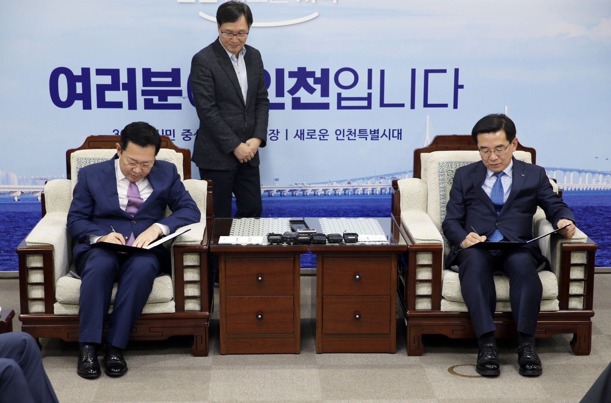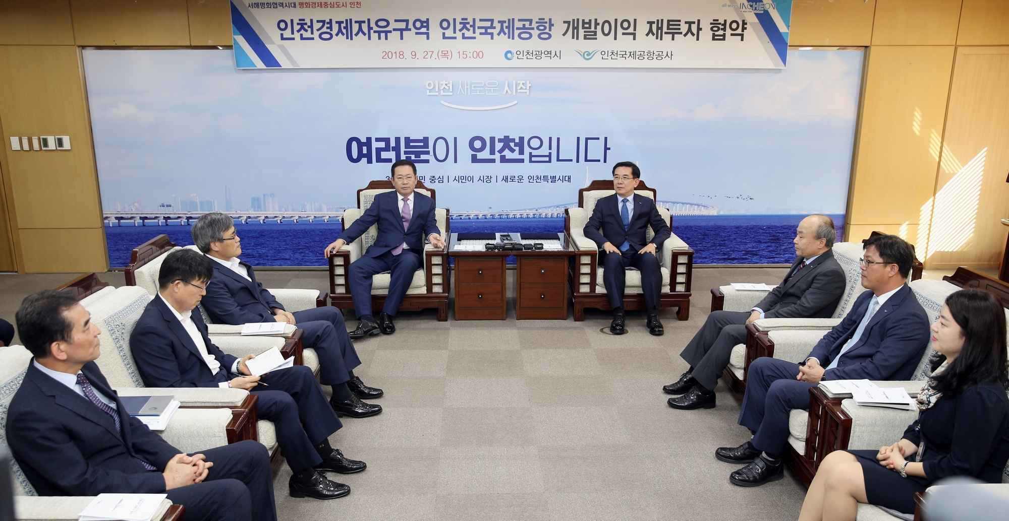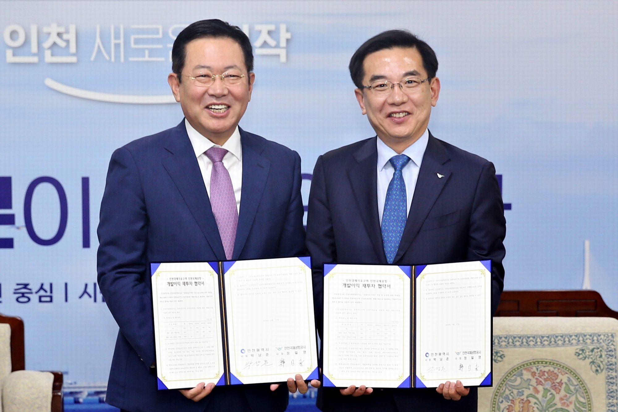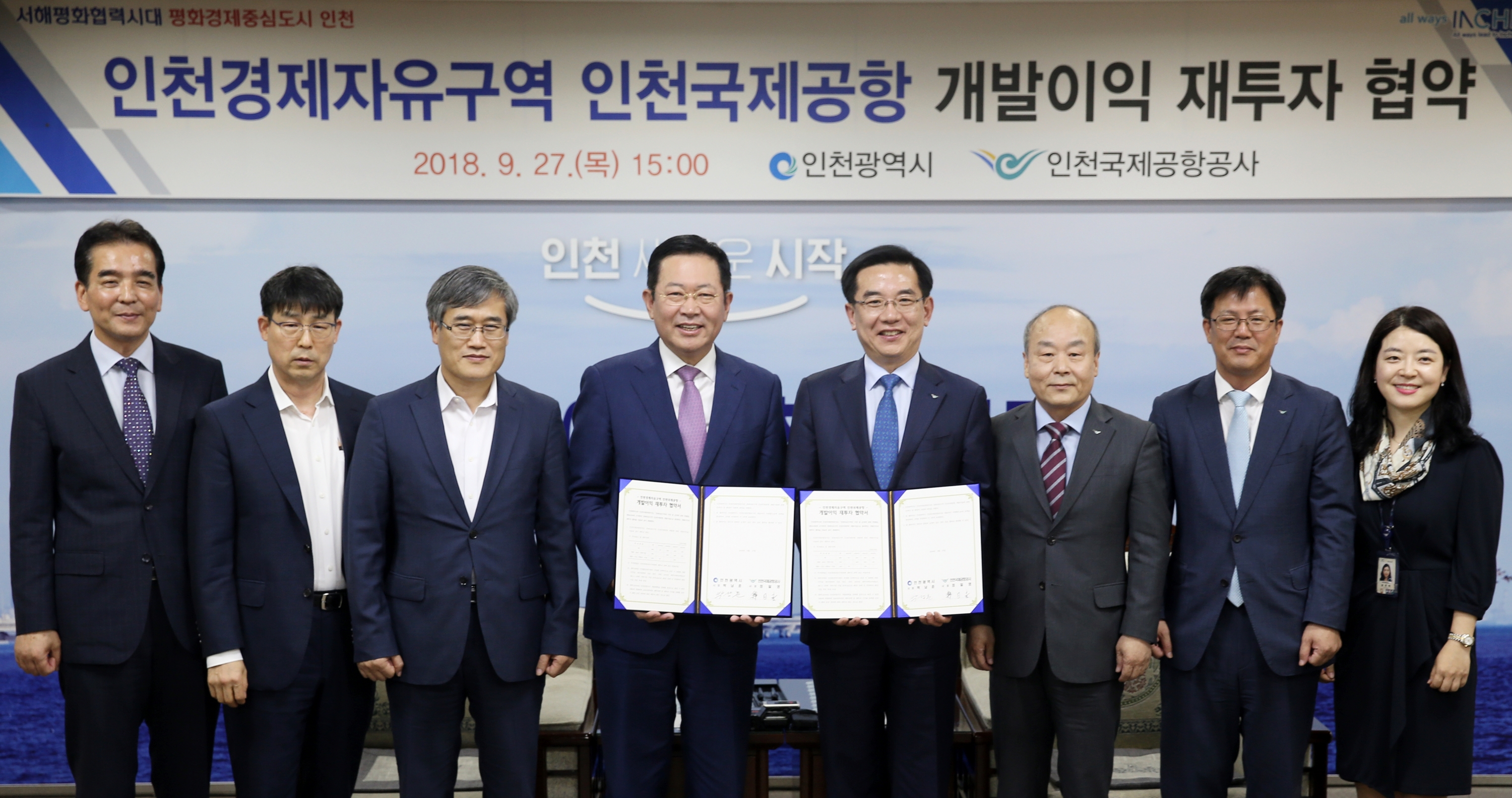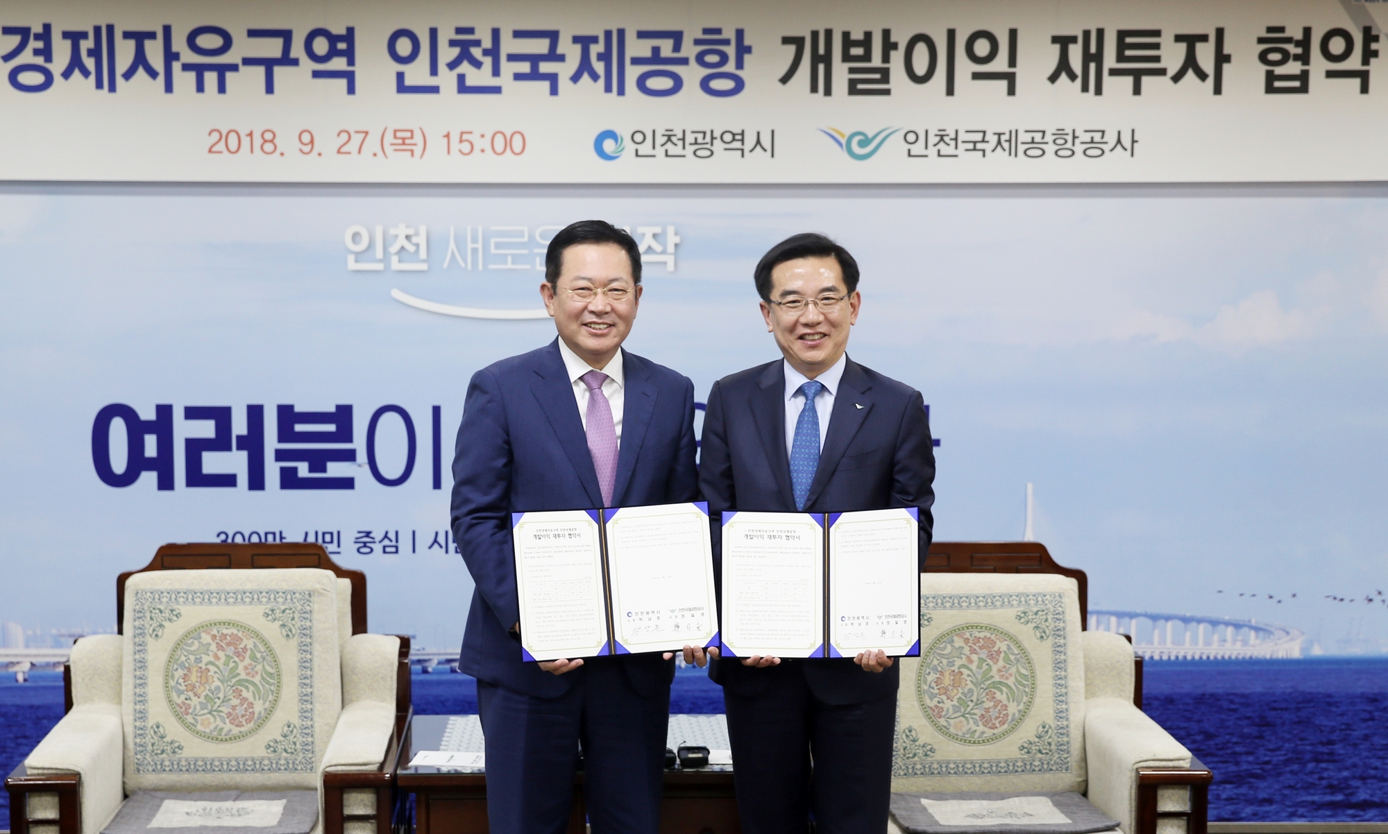 2018년 9월 27일(목요일) 인천광역시청 접견실에서 인천광역시 시장, 인천경제자유구역청 청장, 인천국제공항공사 사장을 비롯한 관계자들이 참석한 가운데 ‘인천경제자유구역 인천국제공항 개발이익 재투자 협약’을 체결했다. 이번 협약은 2022년까지 인천국제공항 개발이익의 10%인 총 881억원(추정치)을 영종‧용유․무의 인근의 기반시설 등에 재투자하며, 경제자유구역법령에 따라 정확한 개발이익 규모를 준공 시 재산정하여 정산한다는 내용이다.