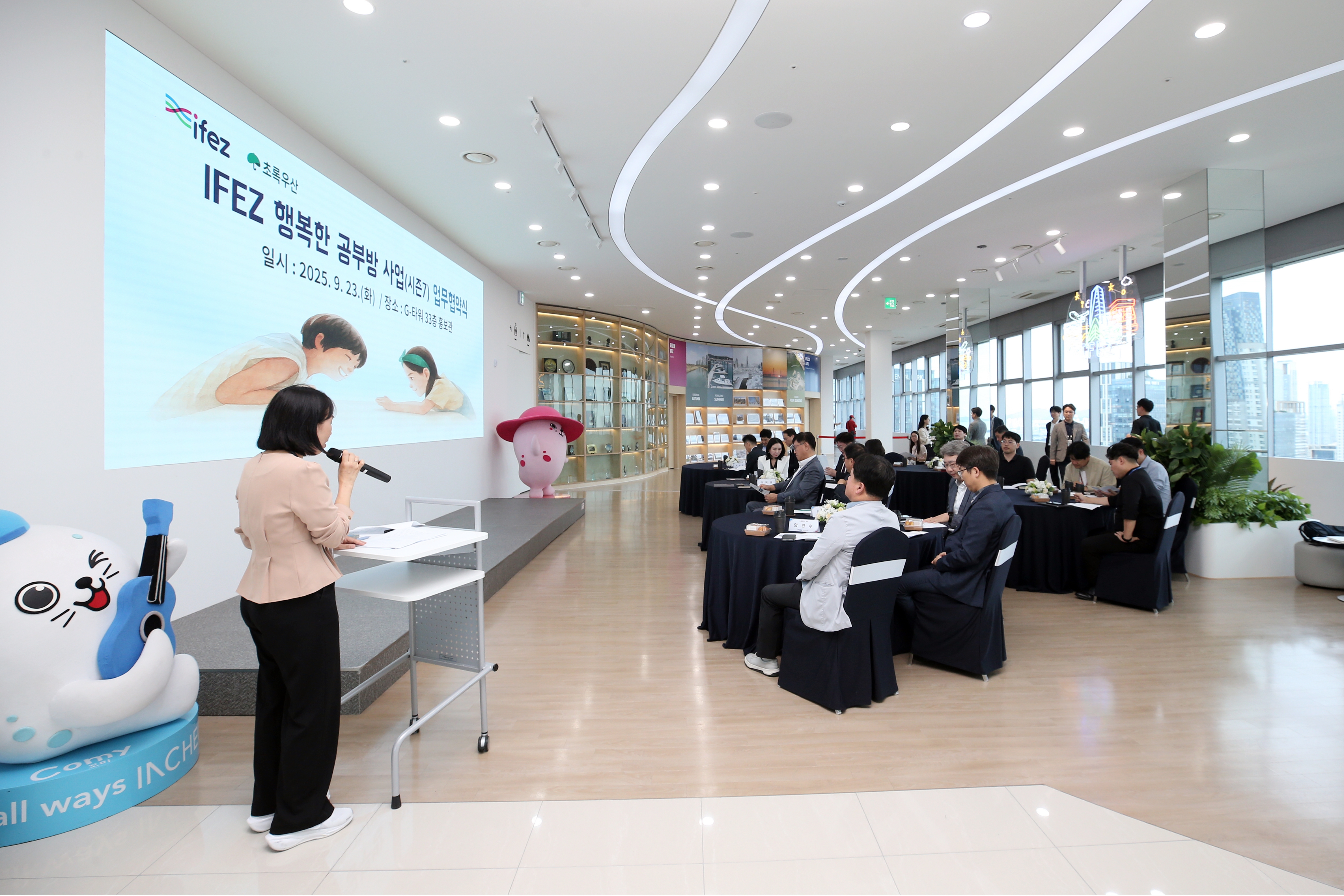 2025년 9월 23일(화요일), IFEZ는 입주기업 10곳 및 초록우산 어린이재단 인천지역본부와 함께 ‘IFEZ 행복한 공부방 시즌7’ 추진을 위한 업무협약을 체결했다. 이 사업은 원도심 주거 취약 아동의 공부방 환경을 개선하기 위해 도배, 장판, 조명 교체와 교육 기자재 지원을 목표로 하며, 2017년 시즌1 시작 이후 지난해 시즌6까지 총 74곳을 지원했다. 참여 기업들은 머크코리아, 아이센스, 얀센백신 등 10개사이며, 초록우산 어린이재단이 사업 전반을 총괄한다.