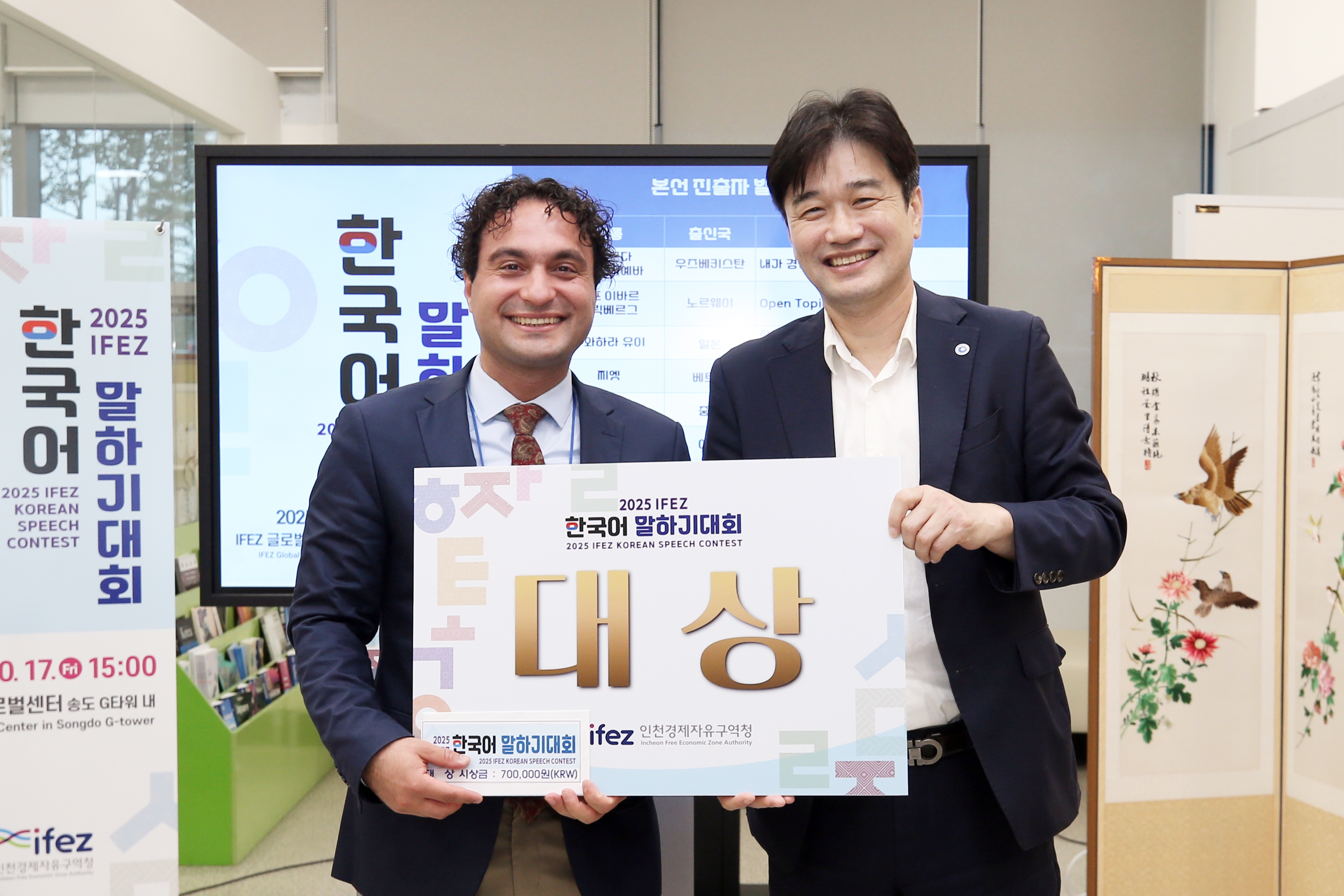2025년 10월 17일(금요일), IFEZ는 송도국제도시 G타워 내 IFEZ 글로벌센터에서 ‘2025년 IFEZ 외국인 한국어 말하기 대회’를 개최했다. 올해로 5회째를 맞은 이번 대회는 IFEZ에 거주하는 외국인을 대상으로 한국어 학습 의욕을 높이고 대한한국 문화의 우수성을 알리기 위해 마련됐다. 예선을 거쳐 본선에 오른 8개국 10명의 참가자들은 ‘내가 경험한 인천과 한국문화’, ‘자유 주제’ 등으로 유창한 한국어 실력을 선보였다. 대상은 ‘태권도가 저의 삶에 주는 영향’을 발표한 이란 국적의 해삼에띤 래자이 씨가 수상했다.