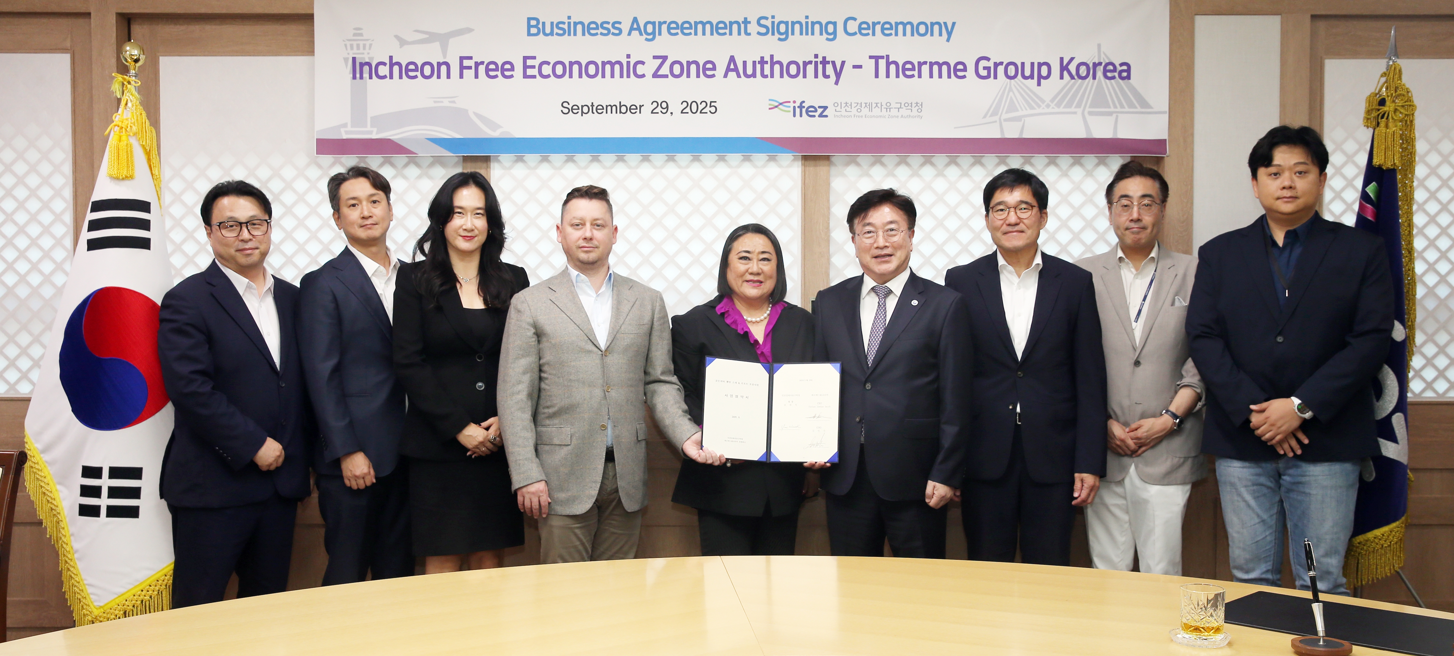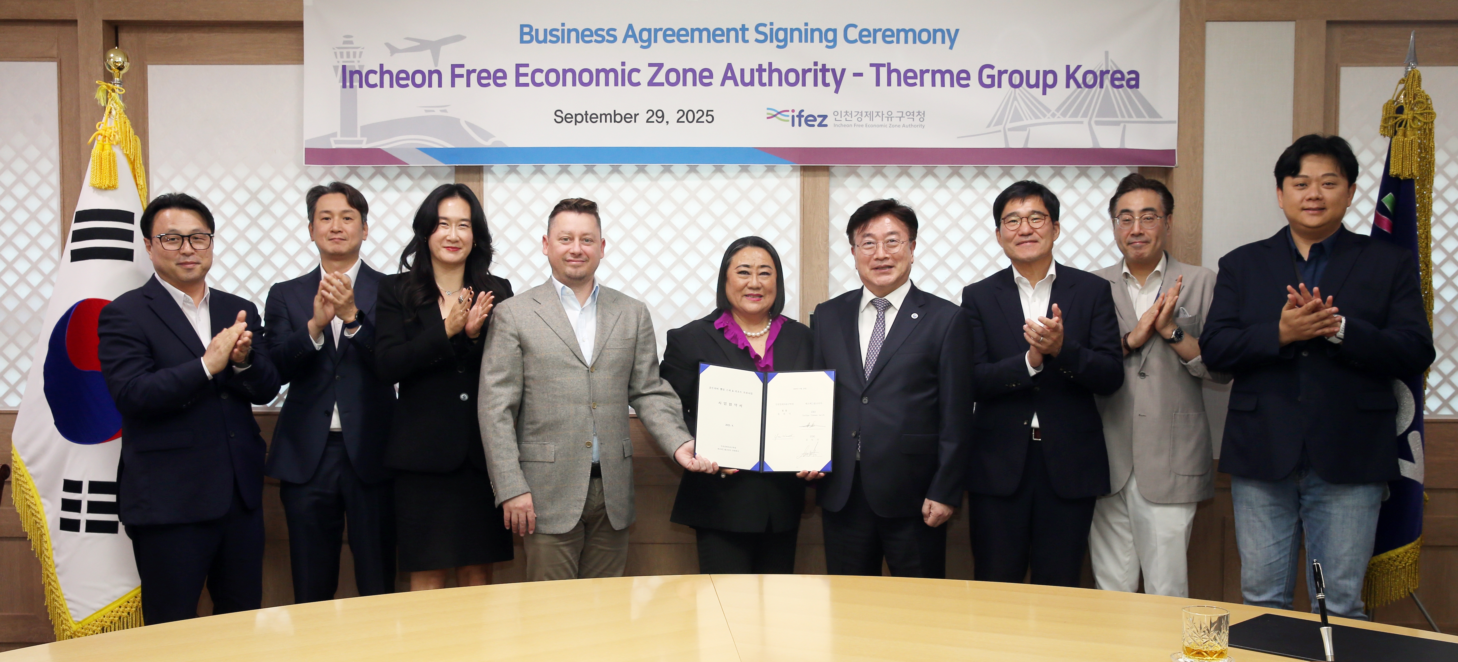 2025년 9월 29일(월요일), IFEZ는 송도국제도시 G타워에서 테르메그룹코리아와 ‘테르메 힐링&스파 리조트’ 사업 기본협약을 체결했다. 이번 협약을 통해 송도국제도시 9공구 골든하버 부지 99,041㎡에 총사업비 약 8,500억 원 규모의 유럽형 힐링&스파 리조트를 조성하는 사업이 본격 추진된다. 테르메그룹은 오스트리아 본사를 둔 글로벌 웰빙 스파 운영 기업으로, 루마니아와 독일 등에서 성공적인 리조트 운영 경험을 갖추고 있다. IFEZ는 2026년 1월 토지 대부 계약 및 본협약 체결을 목표로 행정 지원을 이어갈 예정이다.