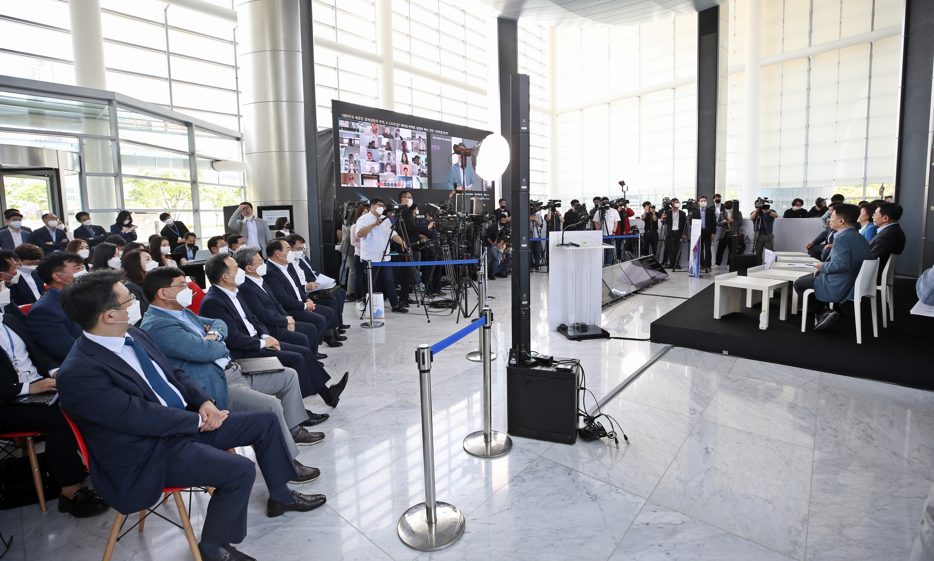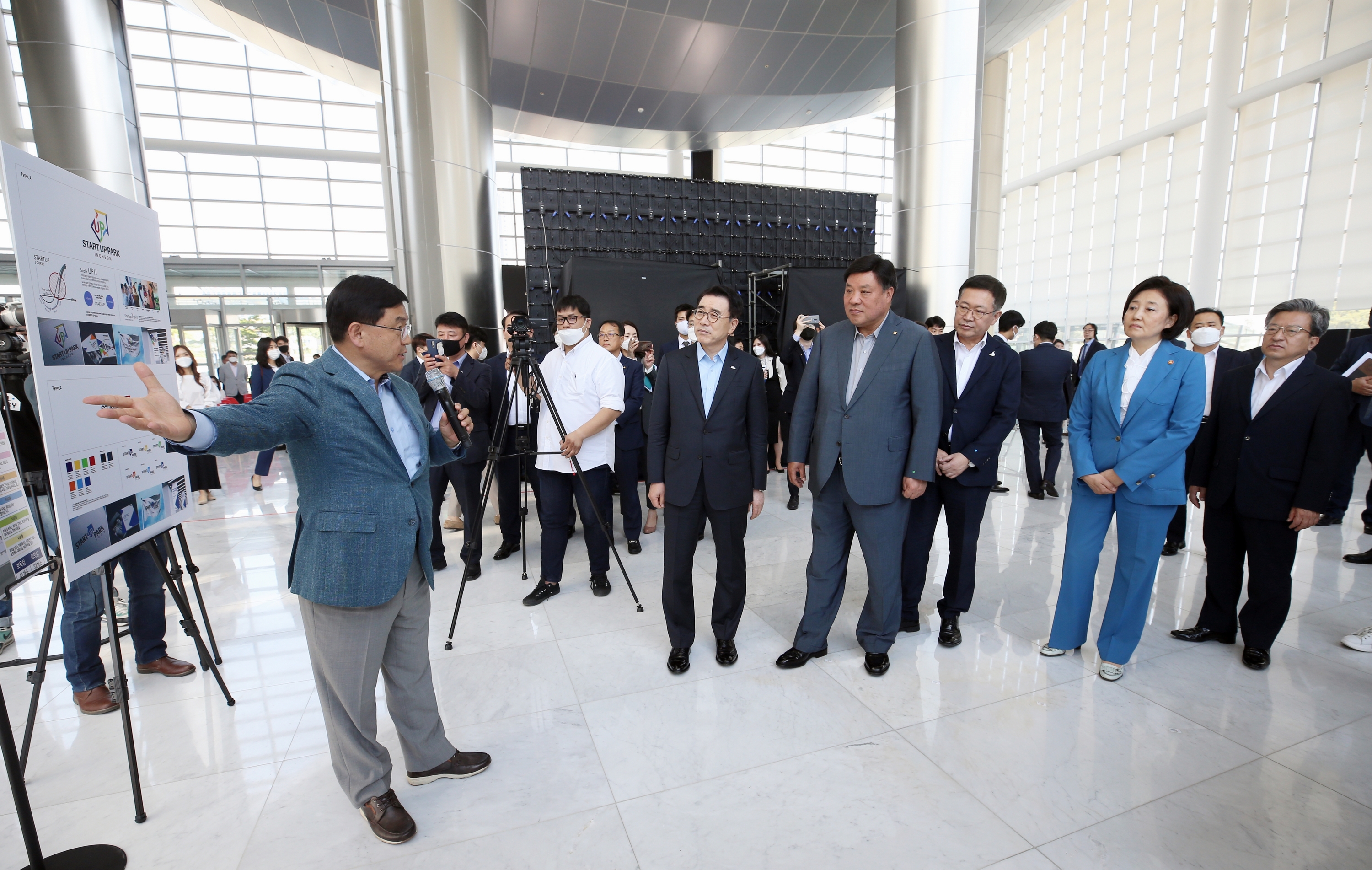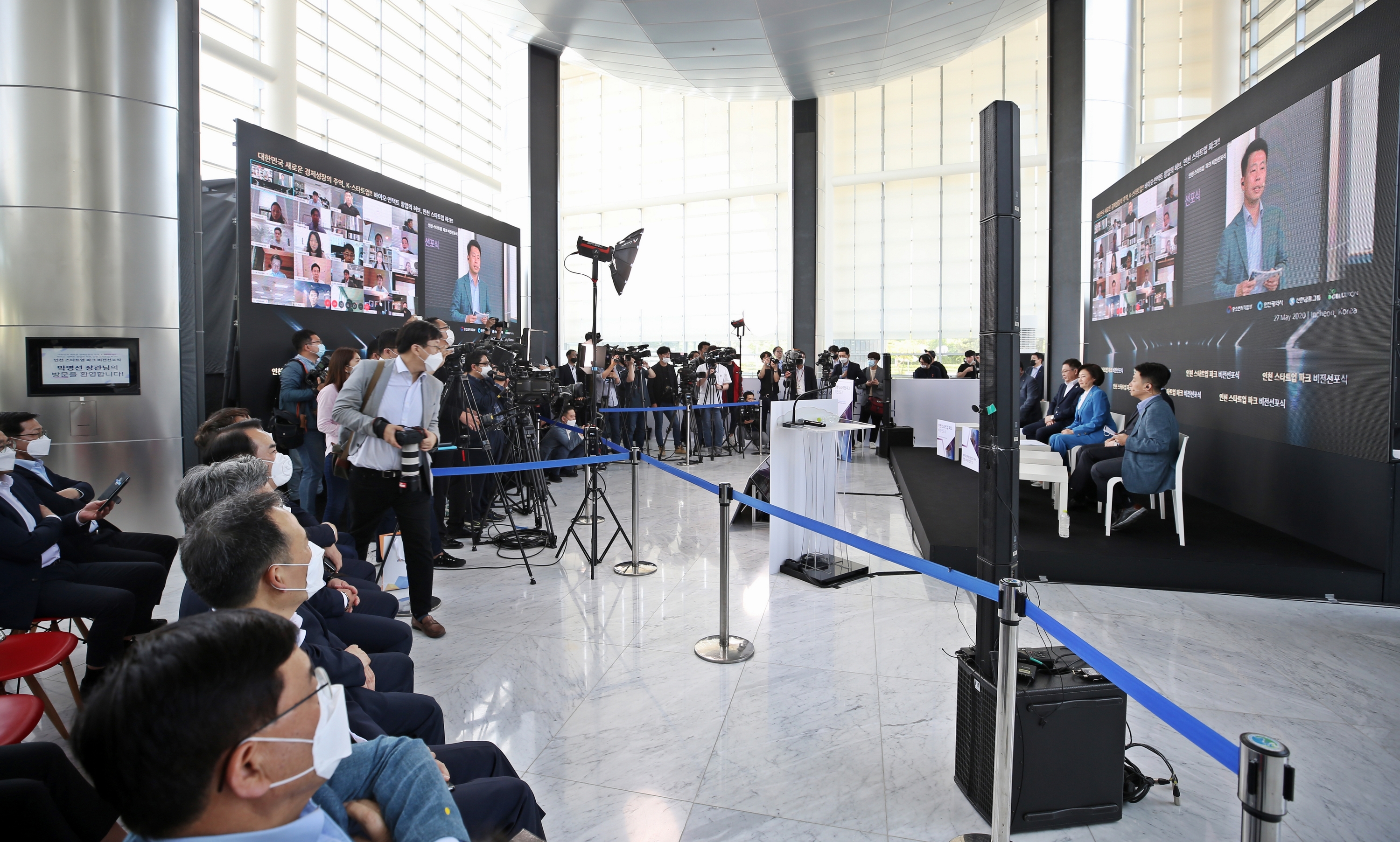 Wednesday, May 27, 2020 IFEZ held the 'Incheon Startup Park Vision Declaration and Mutual Cooperation Agreement' in the lobby of the first floor of Songdo International City, Tomorrow City.'K-Startup, Korea's Leading Economic Growth !! The event held under the theme of 'Bio-Untact Startup Hub, Incheon Startup Park !!', including the Minister of Small and Medium-sized Venture Business, attended offline to practice 'keeping a distance in life' by preventing corona19 virus infection. Minimized and relayed in real time through YouTube. At the vision proclamation ceremony held by video conferencing, attendees discussed strategies for successful establishment of Incheon Metropolitan Startup Park and fostering and supporting Korean startups. Following the Vision Declaration Ceremony, the Mid-Ministry, Incheon City, and Shinhan Financial Group, a private operator, and Celltrion signed a mutual cooperation agreement to create and activate the Incheon startup park startup ecosystem. The main contents of the agreement are △ budget, manpower, and administrative support for the establishment and operation of a startup park, △ business discovery, demand survey, public relations, marketing, and international exchange △ mutual cooperation and support system for the creation of a global specialized start-up complex. Incheon Startup Park is a project selected by Incheon Metropolitan City as the final No. 1 in the startup park competition project promoted by the Small and Medium Business Enterprise to build an open innovation start-up base such as Silicon Valley in the United States and Zhongguancun in China. . The key is to create and operate an open anchor facility to foster startups with a total budget of 241 billion won, including government expenses.