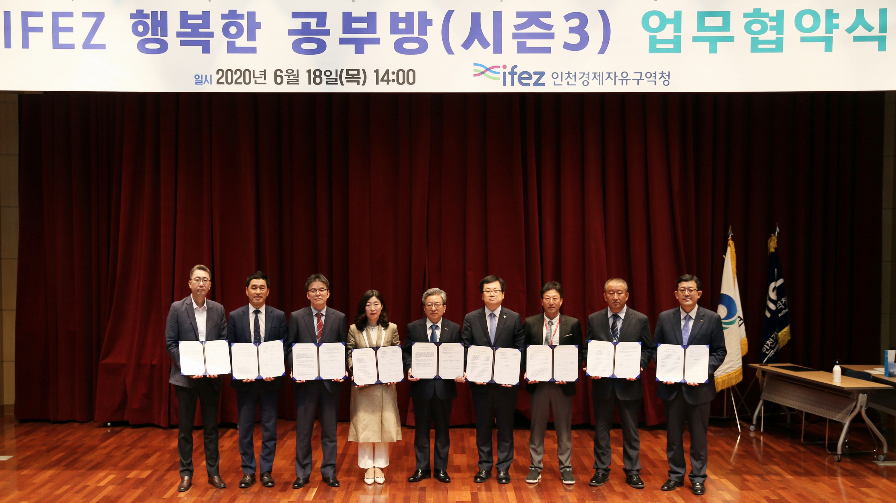 On Thursday, June 18, 2020, IFEZ signed an agreement on "IFEZ Happy Study Room-Season 3." The "Happy Study Room Project" was launched in October 2017 as part of a community contribution project to share IFEZ's urban development achievements with the old city center. IFEZ tenant companies make donations every year to refurbish 10 student study rooms in the original city center with poor residential conditions by wallpaper and lighting replacement, and support educational equipment such as computers and bookshelves. In addition to Yansen Vaccine Co., Ltd., I-Sense Co., Ltd., Nutron Co., Camsis Co., Ltd., and Mitsubishi Elevator Co., Ltd., POSCO A&C Co., Ltd. will participate in this project, and the Incheon Global Campus Operation Foundation will also participate in the project to run learning mentoring programs for children and teenagers eligible for support through volunteer work.