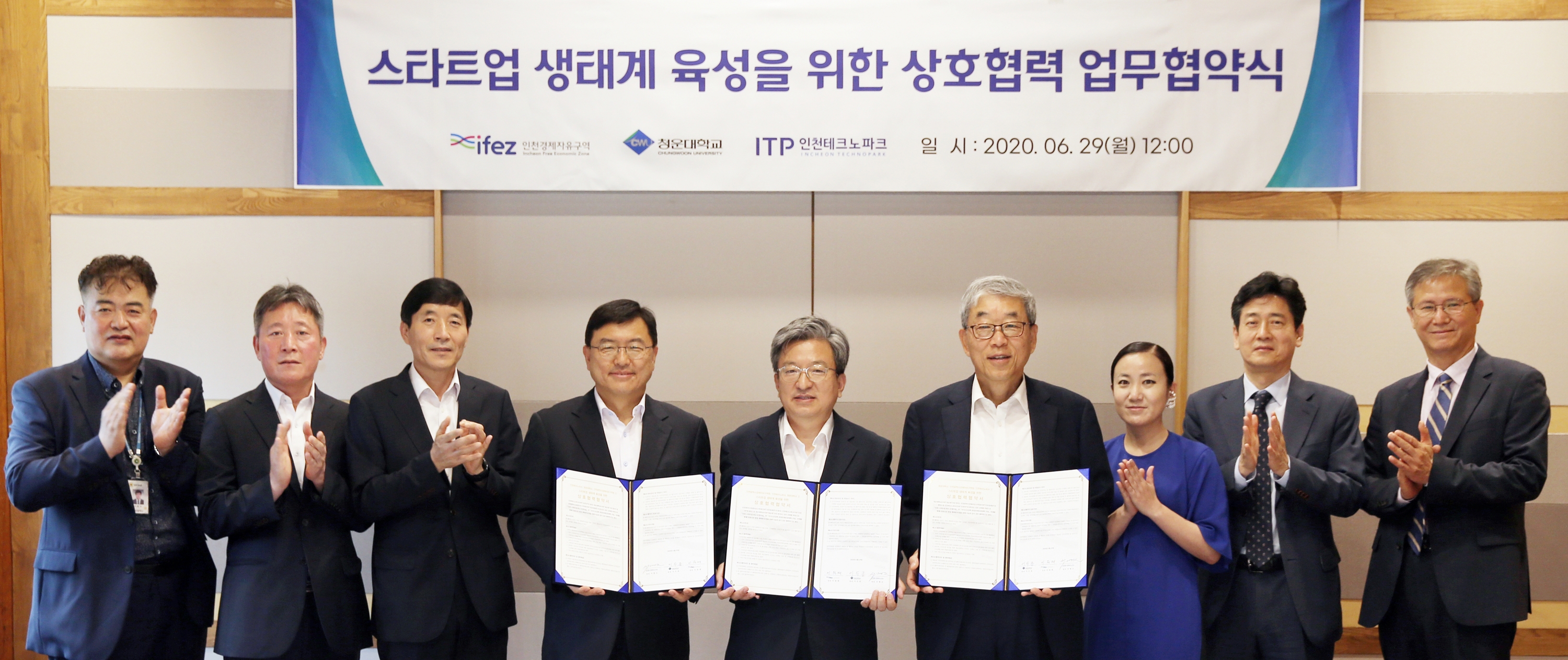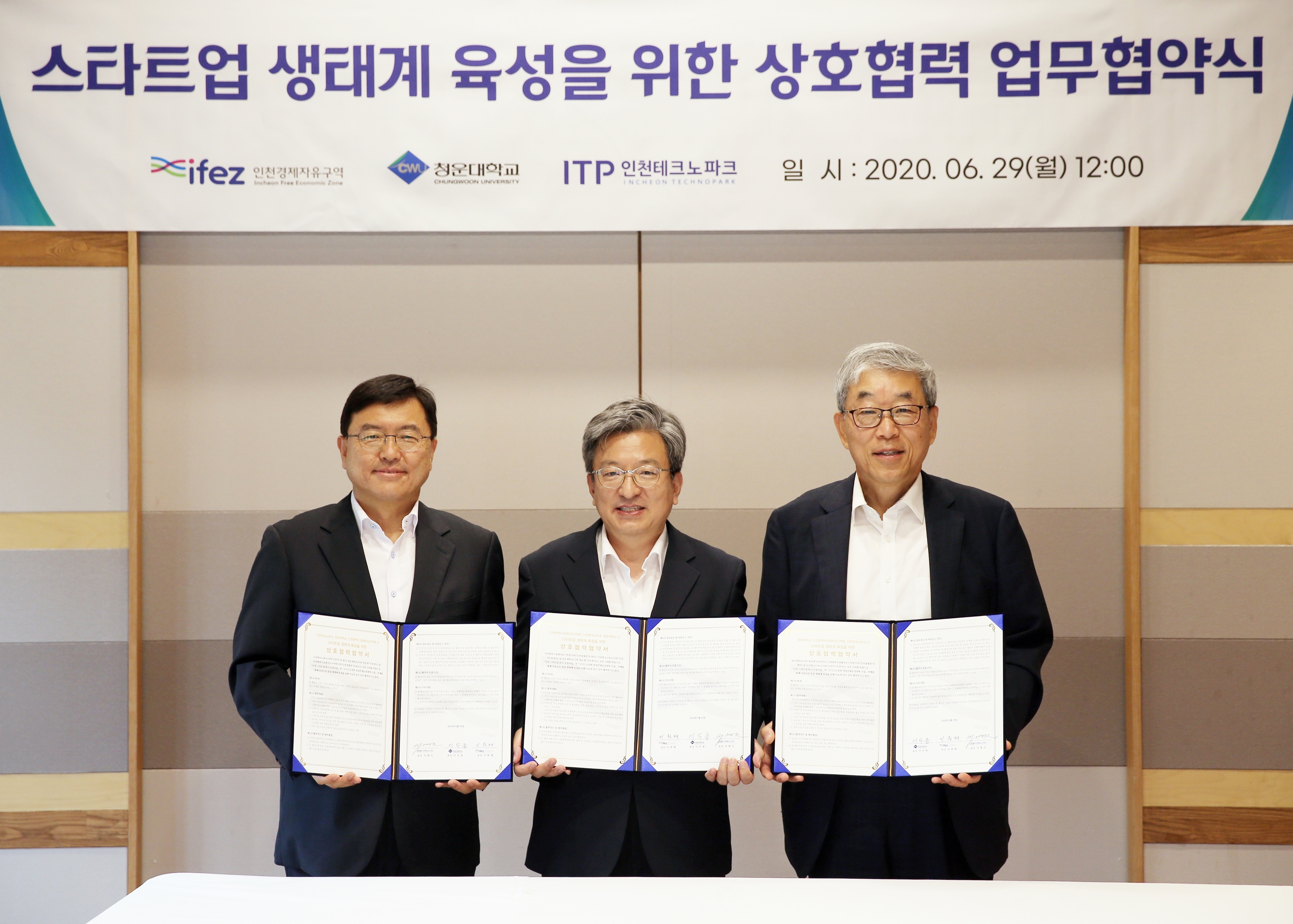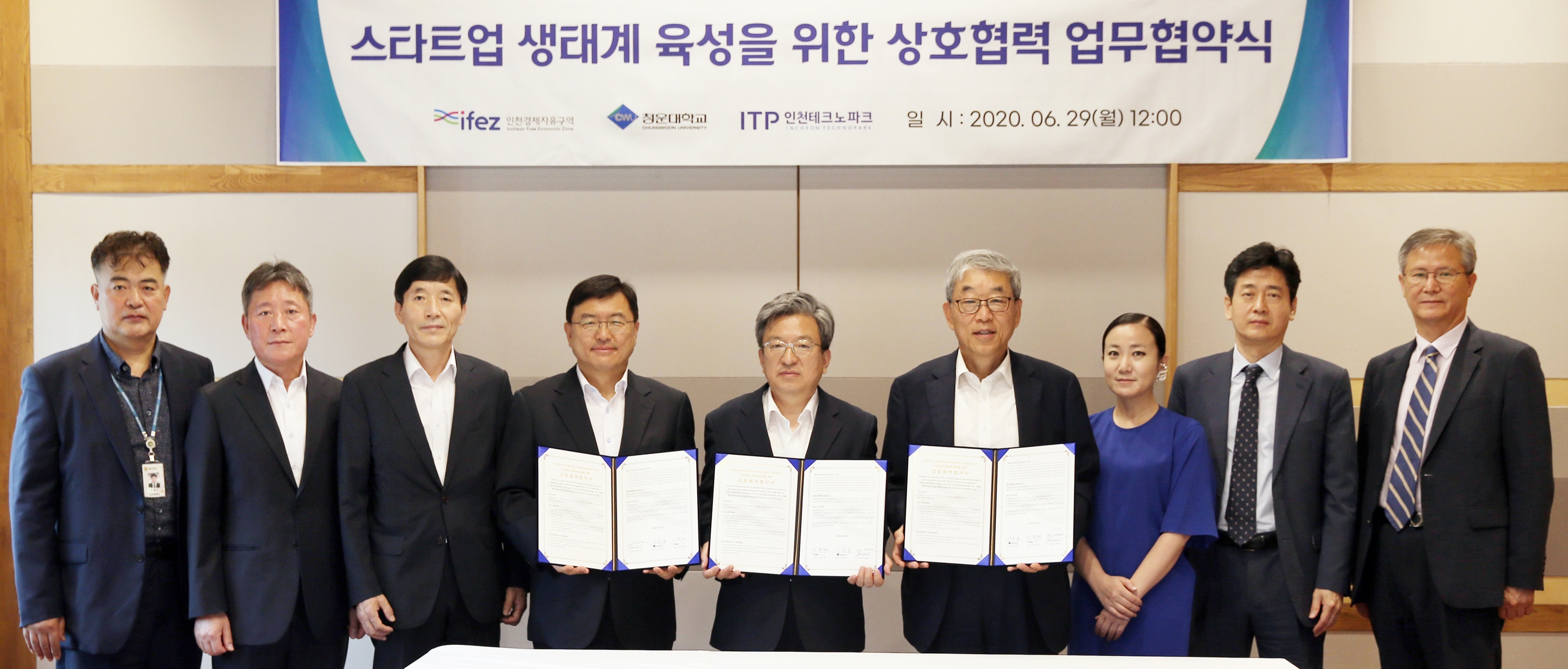 On June 29, 2020 (Monday), IFEZ signed a "mutual cooperation agreement to discover and foster start-ups" with Incheon Techno Park and Chungwoon University in Songdo International City's Gyeongwonjae Ambassador Hotel Incheon. With the signing of the agreement, Incheon Metropolitan City will cooperate in fostering startups in Incheon and creating jobs in the region, including employment, by linking the Incheon Startup Park creation project, which is being promoted with the Ministry of SMEs and Venture Business, with the National Labor Scholarship Employment-linked university project, which Chungwoon University is working with the Ministry of Education. Major contents of the agreement include supporting startups through linkage of state-run projects such as national work, scholarship, employment, and university projects, establishing a support system for start-ups and promoting global specialized clusters.