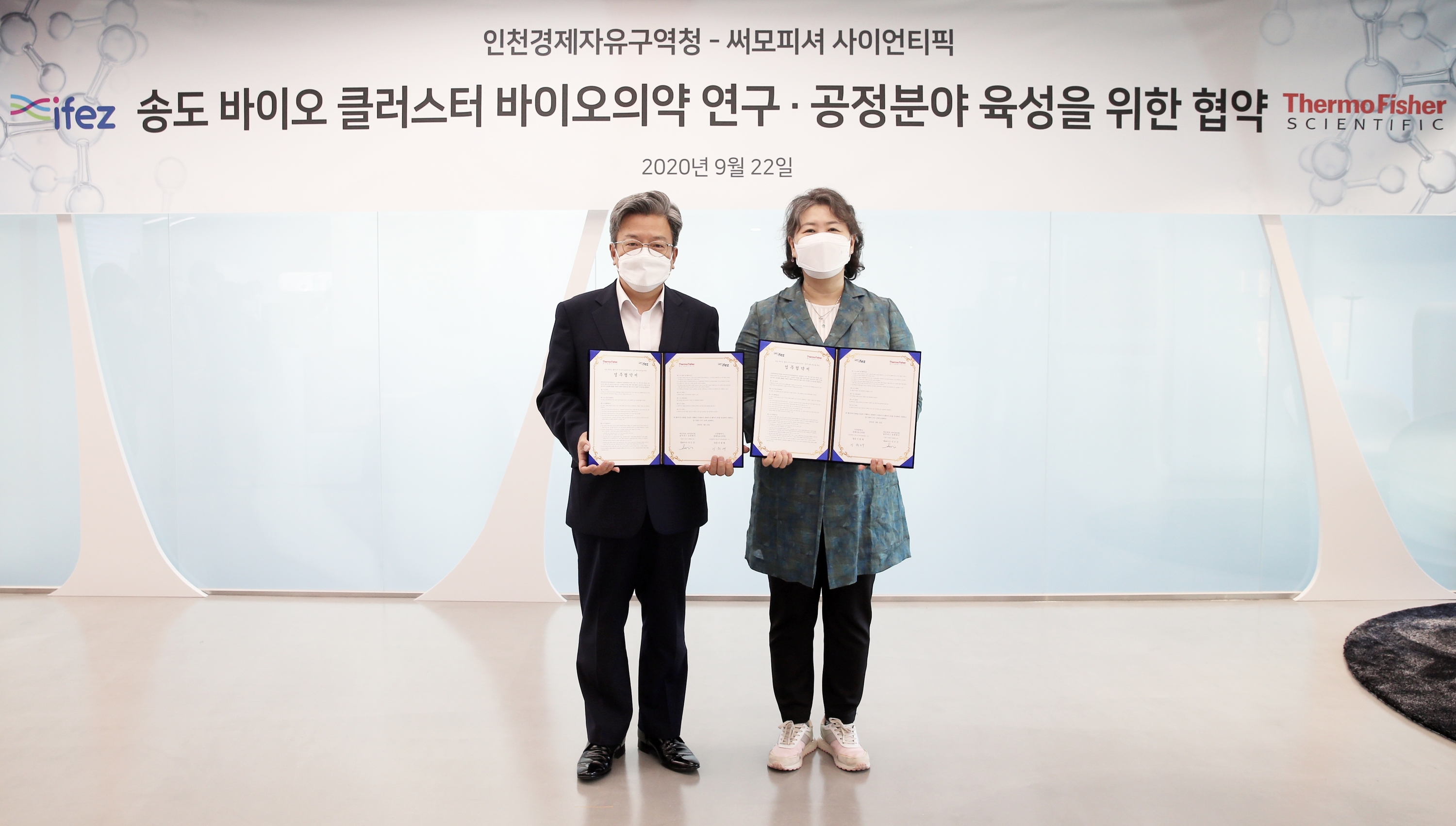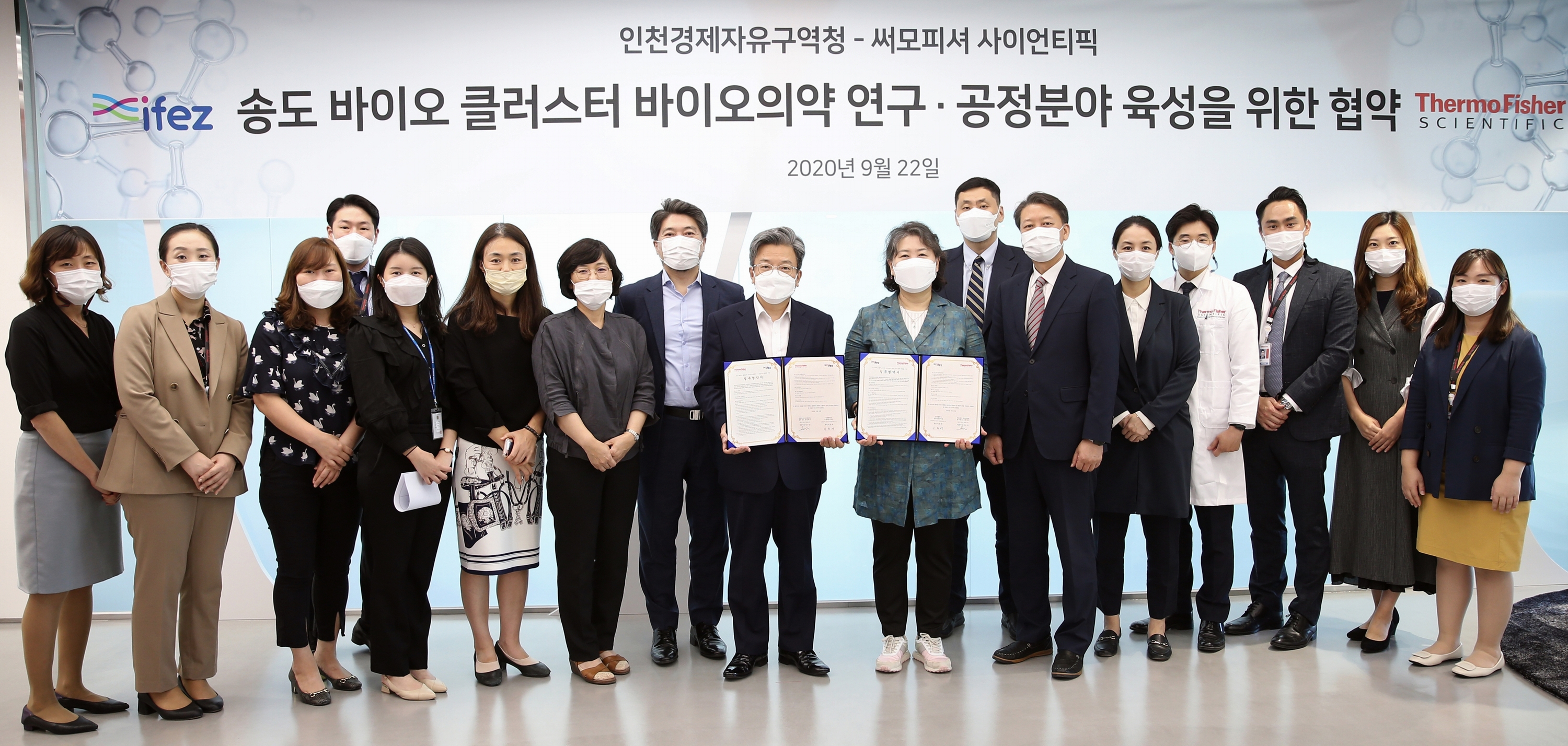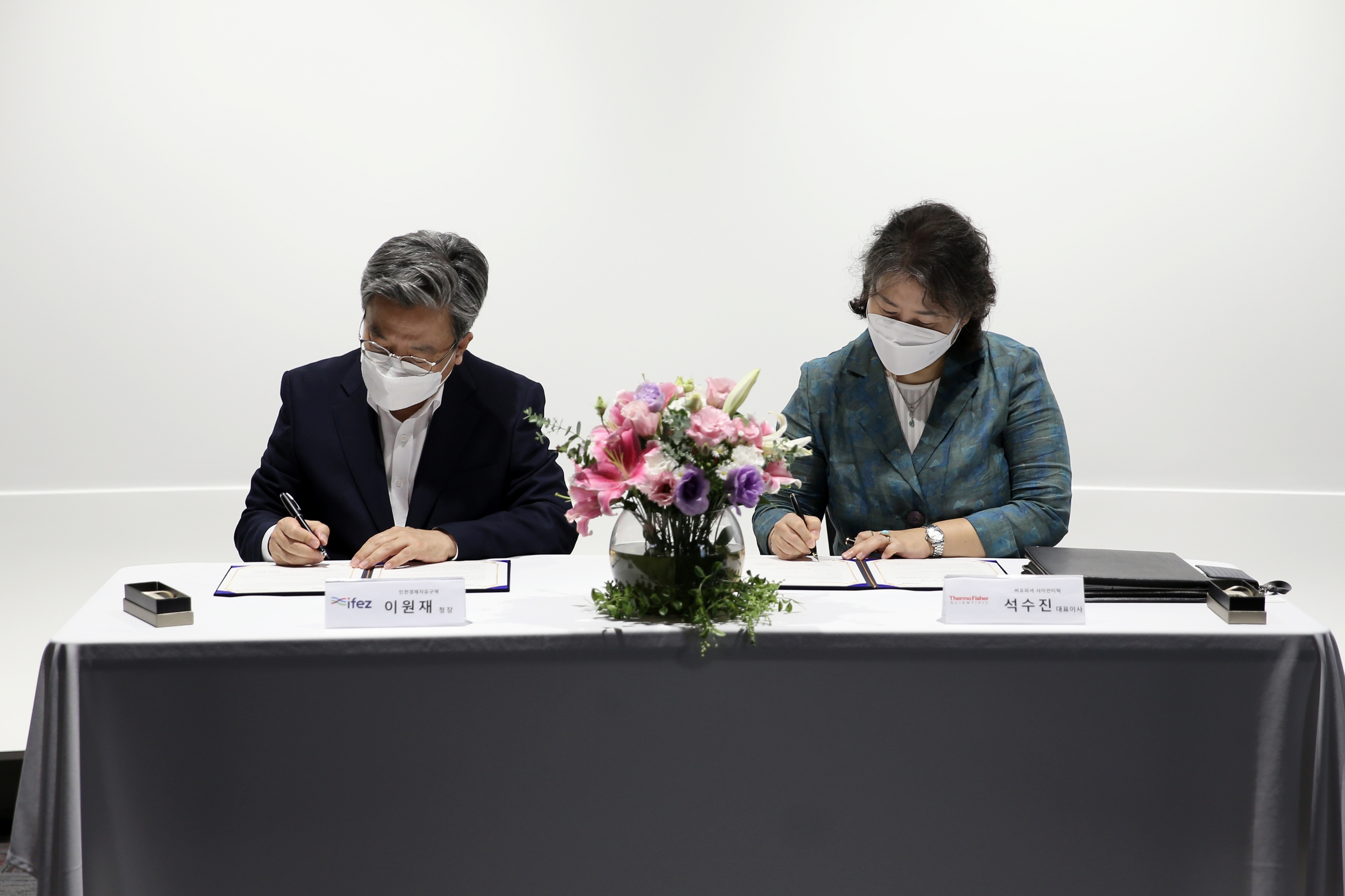 On September 22, 2020 (Tuesday), IFEZ signed an agreement with Thermo Ffischer Scientific Korea, the Korean subsidiary of Thermo Fischer, to foster bio-medicine research and process in Songdo International City. The Bioprocess Design Center (BDC), which will be built this time, will have about 100 equipment that can be used from basic research to production of bio-medicine in animal cell and microbial culture rooms, cell culture badges and buffers preparation rooms, and refining and analysis laboratories that reproduce biopharmaceutical production processes.