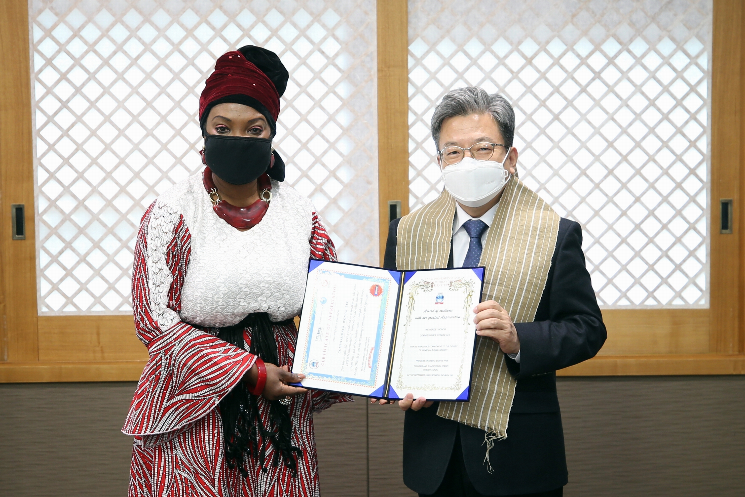 On Thursday, December 10, 2020, IFEZ Commissioner Lee Won-jae received a plaque of appreciation from the foreign community "EPBWN (Expat Professional Business Women's Network." He received a plaque of appreciation from Princess Pam, chairman of the EPBWN community, to thank her for community cooperation and support.