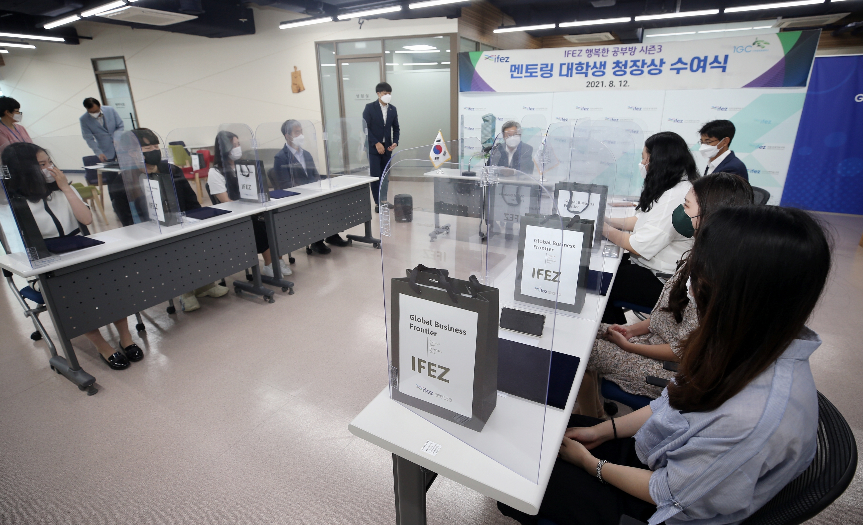 On August 12, 2021 (Thursday), IFEZ awarded the Commissioner's Award to 12 college students attending Incheon Global Campus who served as mentors for the "IFEZ Happy Study Room Season 3." The IFEZ Happy Study Room is a project to renovate a room for poor children in the original city center and create an environment to develop their dreams, supported by IFEZ resident companies and the Incheon Regional Headquarters of the Green Umbrella Children's Foundation. △CAMSIS (CEO Park Young-tae), △Nutron (CEO Cho Hak-rae), △Iceense (CEO Cha Geun-sik), △Jansen Vaccine (CEO Cherry Hwang), △Posco A&C (CEO Kim Dae-won), and △Mitsubishi Elevator Korea (CEO Junichiro Sioka) have raised a total of 6000 won.