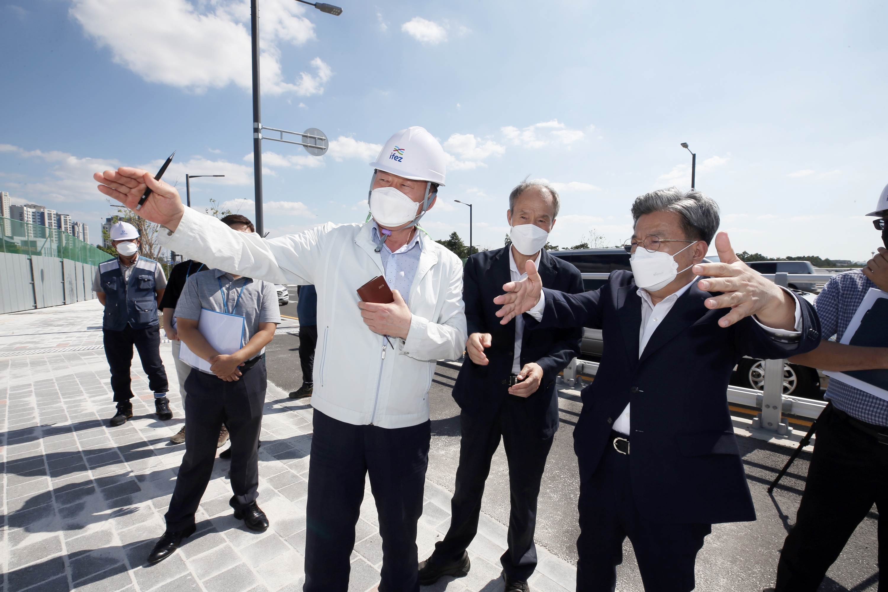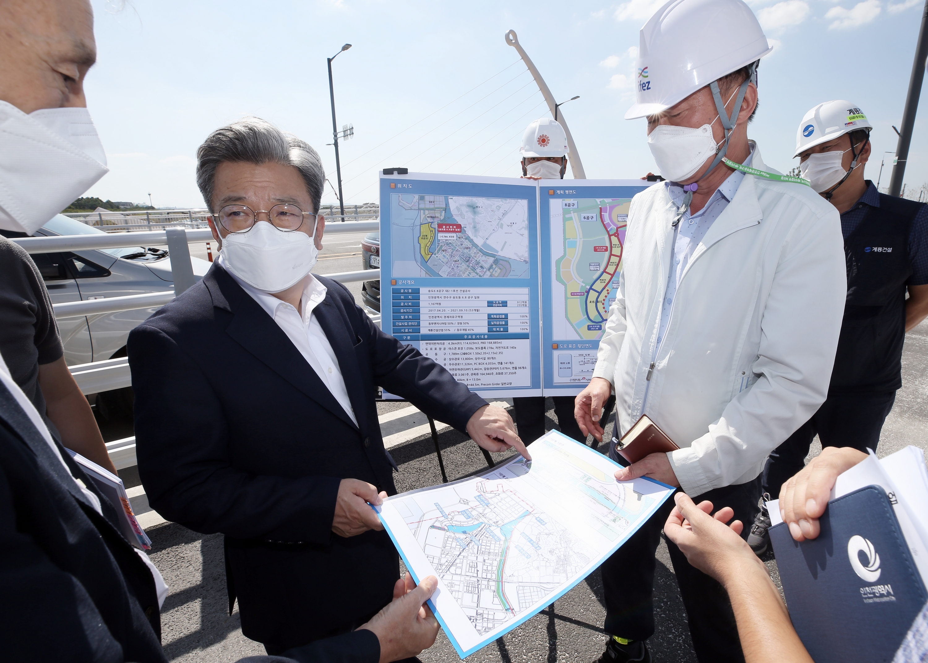 On September 15, 2021 (Wednesday), Lee Won-jae, head of the Incheon Free Economic Zone Authority, visited the infrastructure construction site for the 6·8 tools of Songdo International City. The first phase of the infrastructure construction for Songdo International City 6·8 was completed in May 2017, and the second phase road east of Incheon Bridge was also recently opened 5.7km. The Incheon Free Economic Zone Authority plans to continue the construction of the 8.4km three-stage road west of District 6 and complete it by 2023.