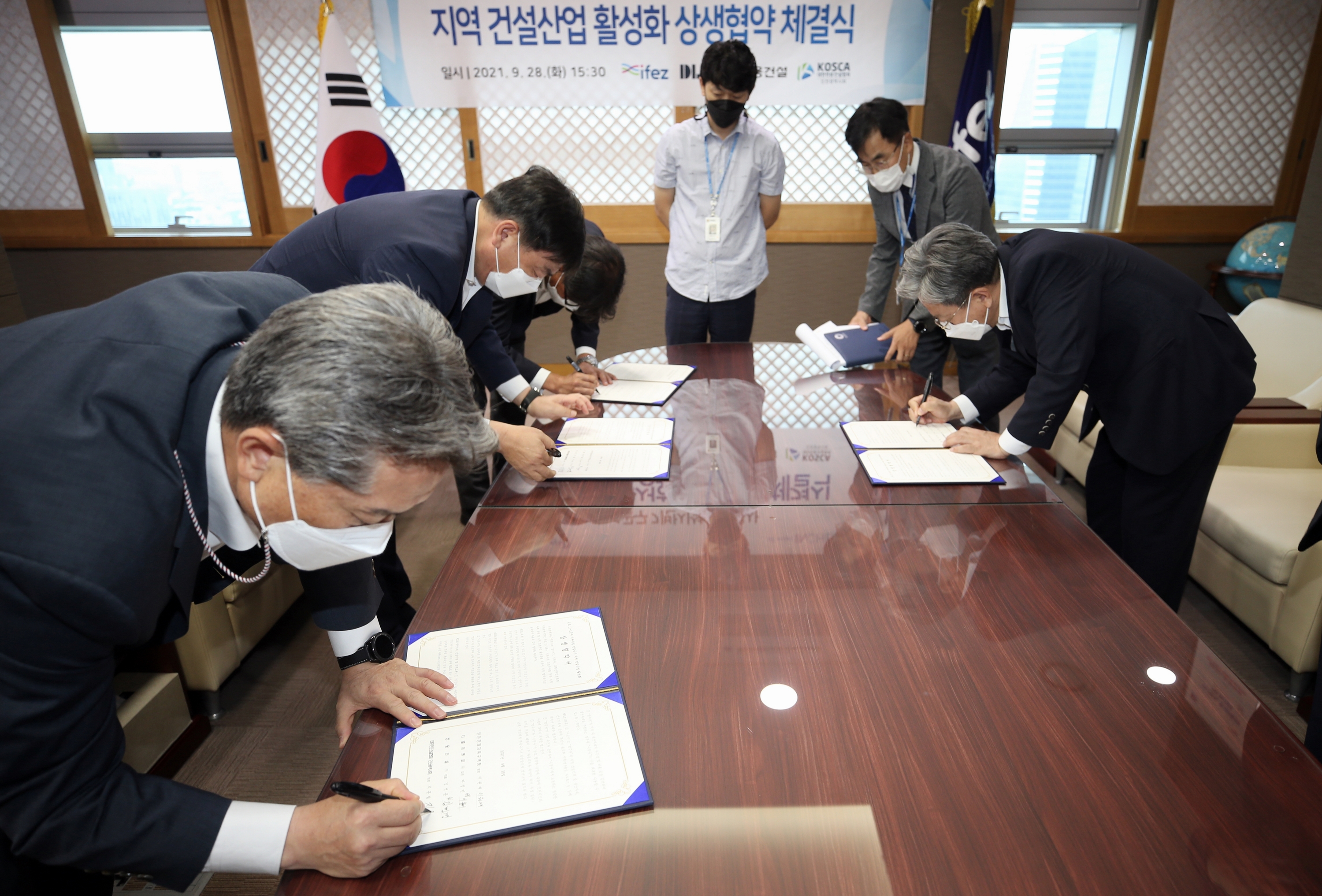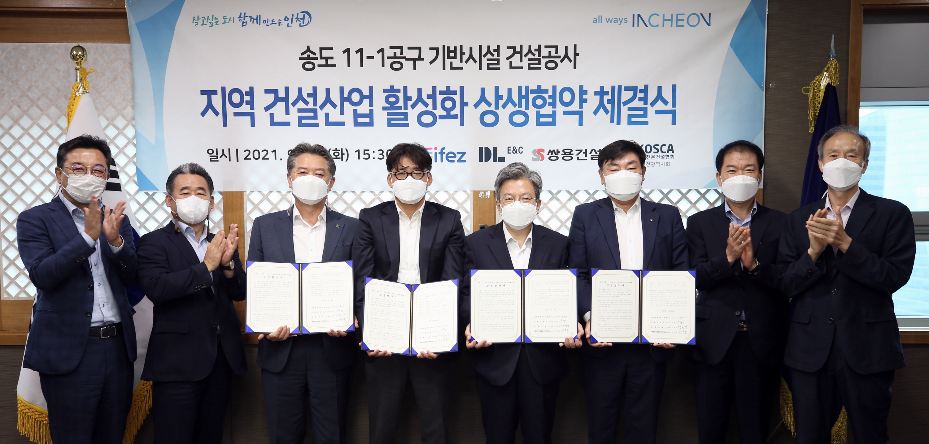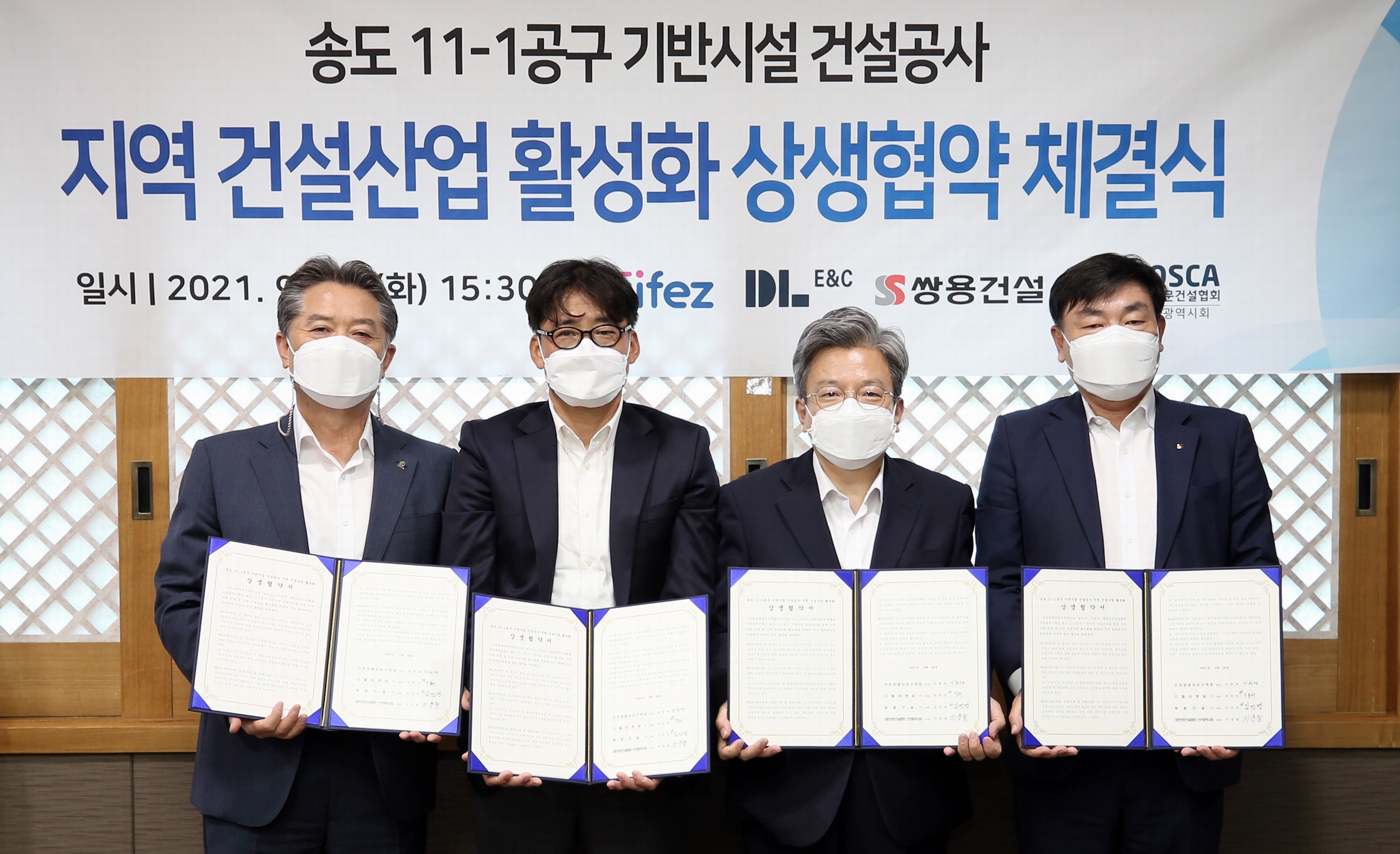 On September 28, 2021 (Tuesday), IFEZ signed a "win-win agreement to revitalize the local construction industry" with DL&C, Ssangyong Engineering & Construction Co., Ltd., and the Korea Professional Construction Association, an infrastructure contractor for Songdo International City 11-1. The main content of this agreement is that infrastructure contractors will make utmost efforts to participate in the construction of construction companies in Incheon Metropolitan City, use local materials and equipment, and recruit manpower in relation to the construction of Songdo International City Building 11-1.