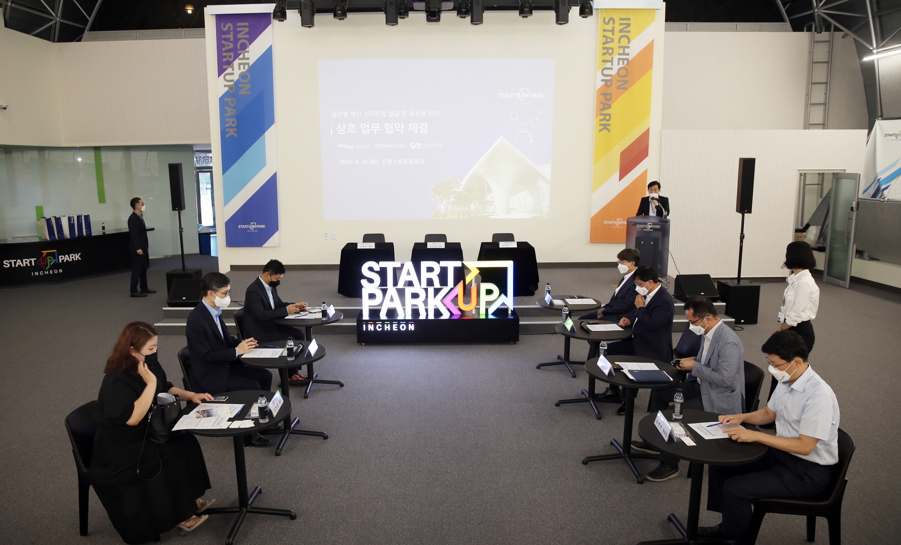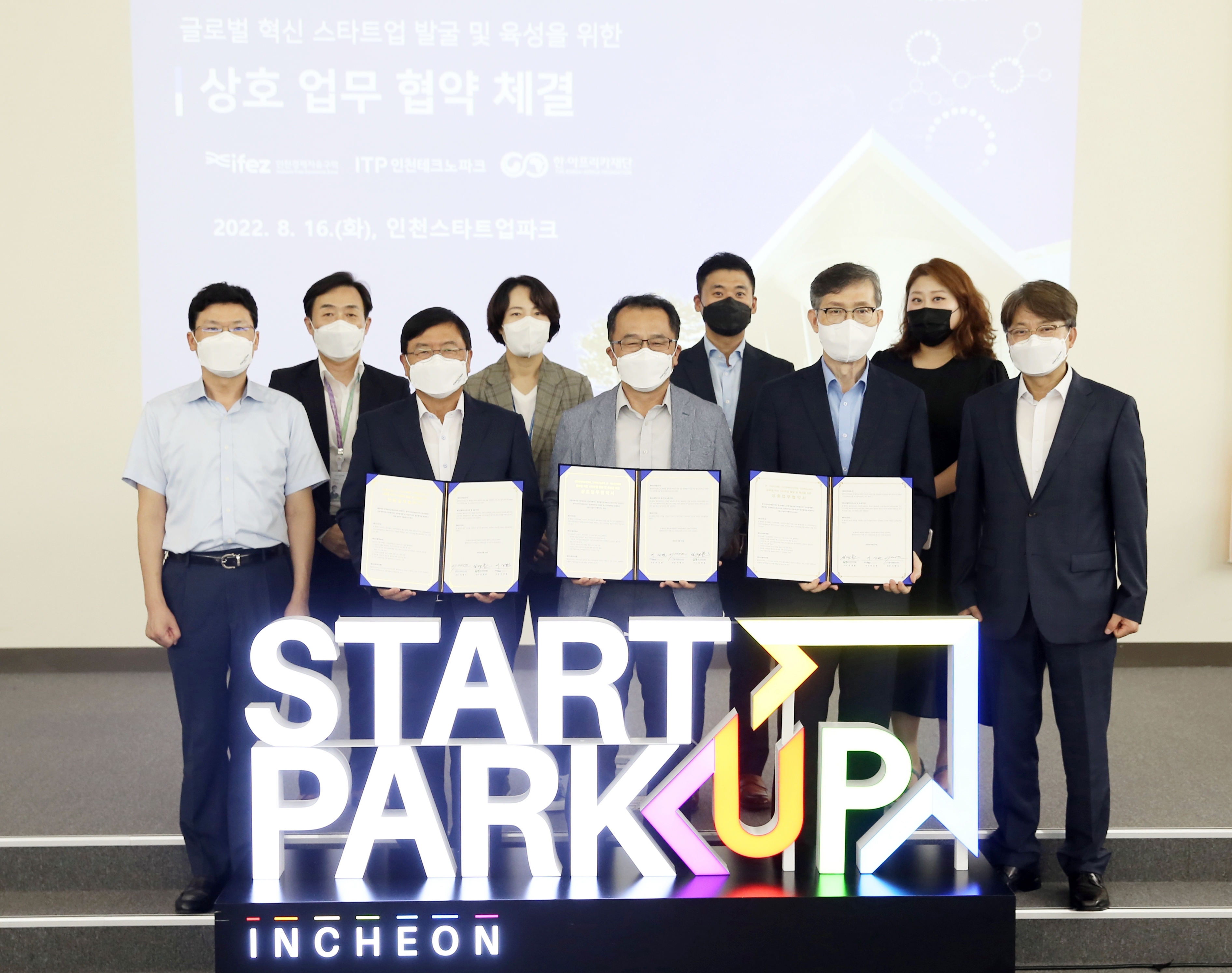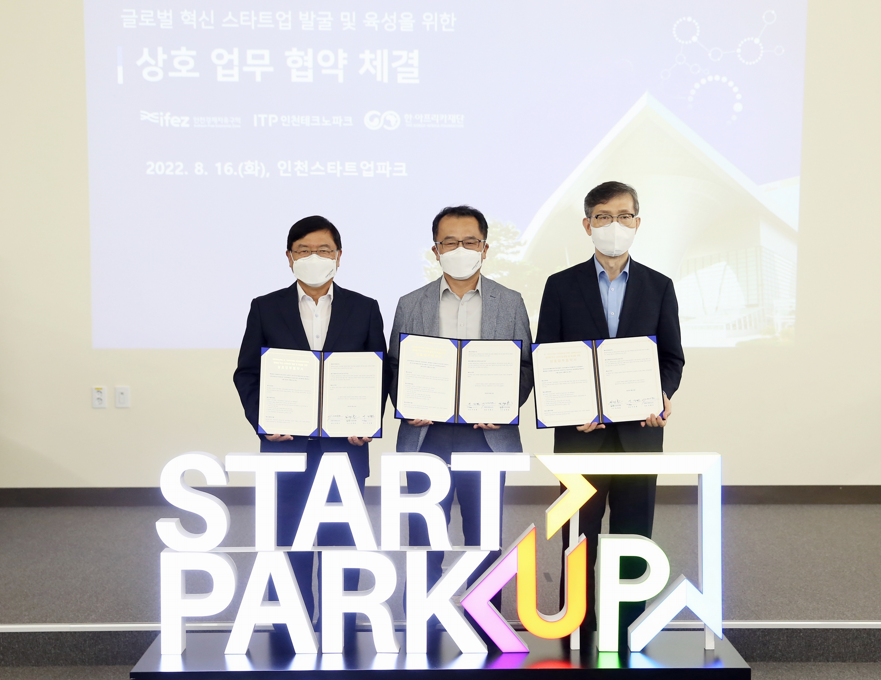On August 16, 2022 (Tuesday), IFEZ signed a mutual business agreement with Incheon Techno Park and the Korea-Africa Foundation to discover and foster global innovative startups. The main contents of the agreement include joint discovery and fostering of innovative startups wishing to enter △ Global, linking Incheon Startup Park with the Korea-Africa Foundation's startup discovery and fostering program, linking demonstration resources to support global demonstration of △ Global startups.